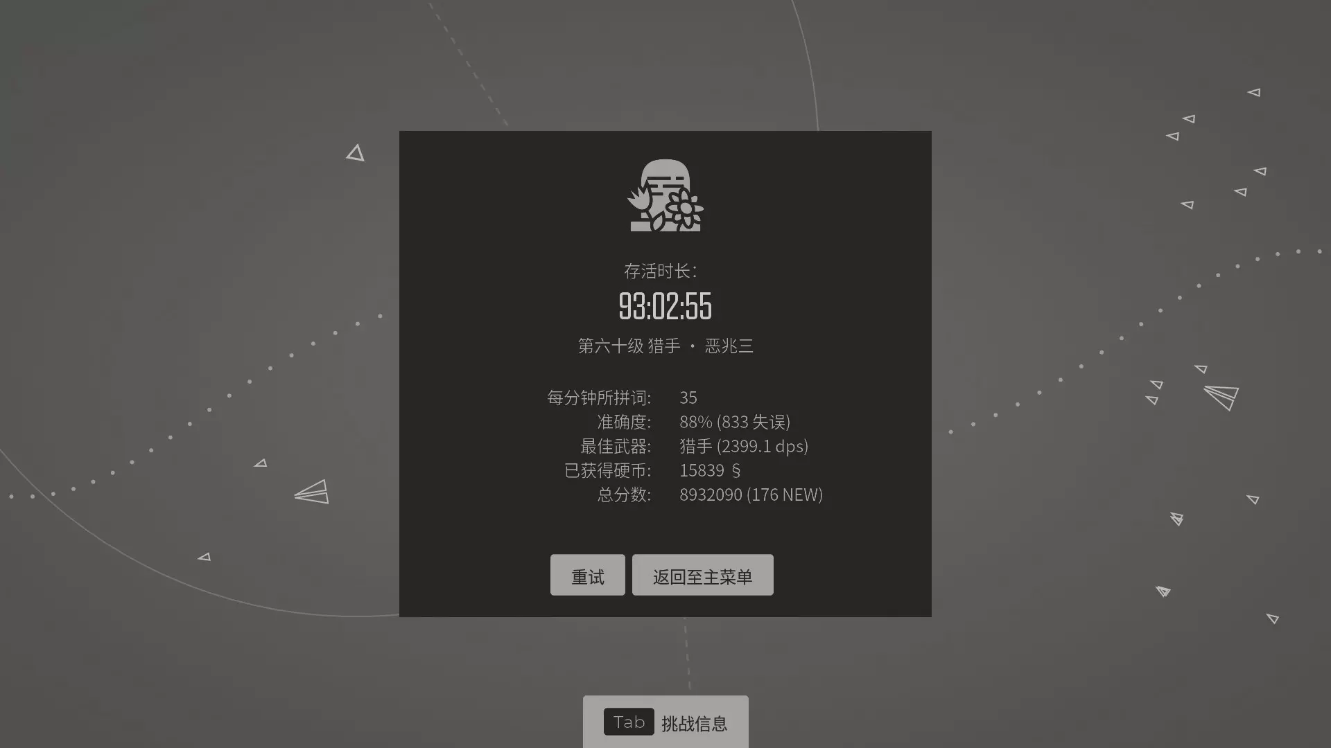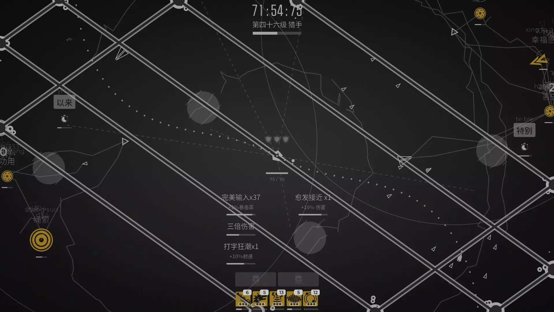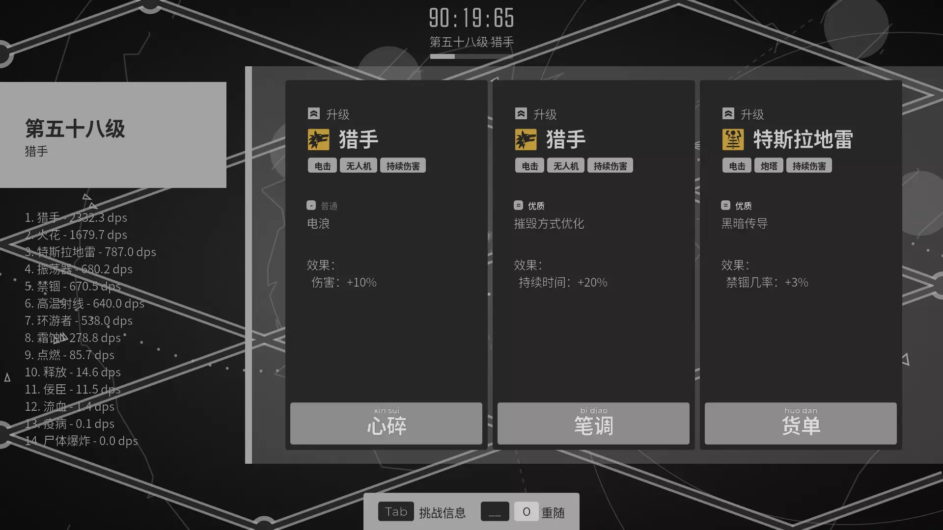关于武器进化方向 如上所述主打电击伤害,所以一切的电转火/电转毒这些都是不选的:猎手不选电能镖,特斯拉不选电流灼烧,其余的无所谓。 其他的就没什么特殊的了,猎手和特斯拉的每秒伤害很快就能达到500,但是后几者就需要慢慢花时间提升到500,尤其是我最后选择的武器环游者,猎手我只升级了6次,环游者我升级了21次才勉强达到500。最后一共花费93分钟,完成了这五个武器的500每秒伤害目标。