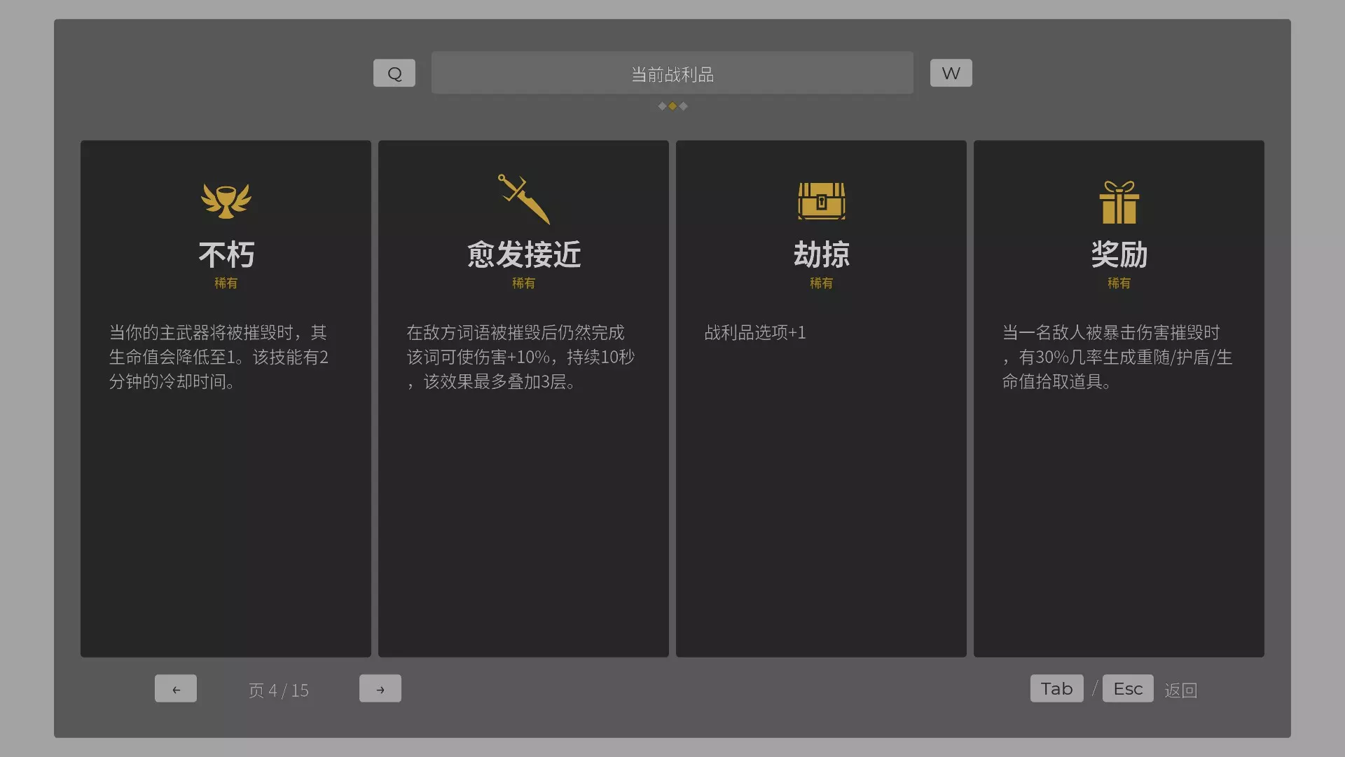 关于战利品,这套打法比较需要的是【霜弒】(冰冻掉落几率+2%)、【极冰科技】(效果同上)、【巨型磁铁】(50%几率自动拾取道具)。其余的比如【皮纳塔】(全局战利品掉落+20%)、【劫掠】(战利品选项+1)、【三倍伤害】(双倍道具变三倍)这些稀有战利品的重要性自不必多说。因为后期的怪量多血厚,我经常感觉要打不过去的时候屏幕里就会掉落冰冻道具,而且是一次掉两三个,常常会因为冰冻时间太久导致完美输入断开。但其实关于战利品这方面,我自己在前期打的时候并没有意识到这一点,我是刷到什么稀有选什么。游戏后期升级速度较慢,但掉落的战利品数量较多。我曾在93分钟内获得了15页的战利品,因此无需特别担心战利品的获取问题。