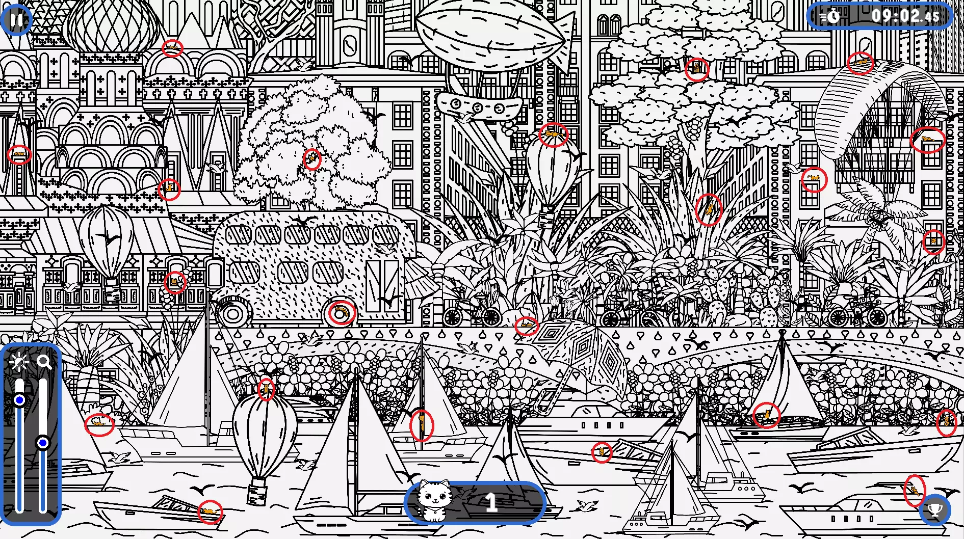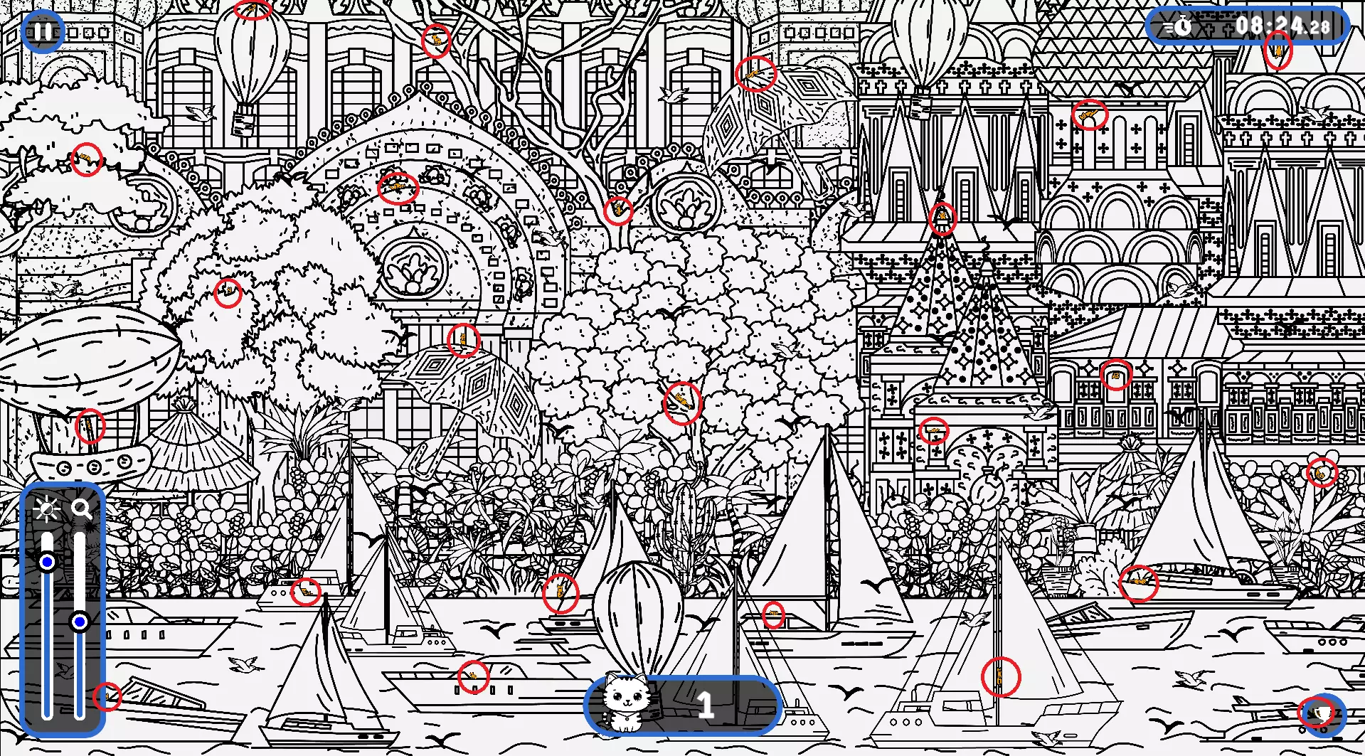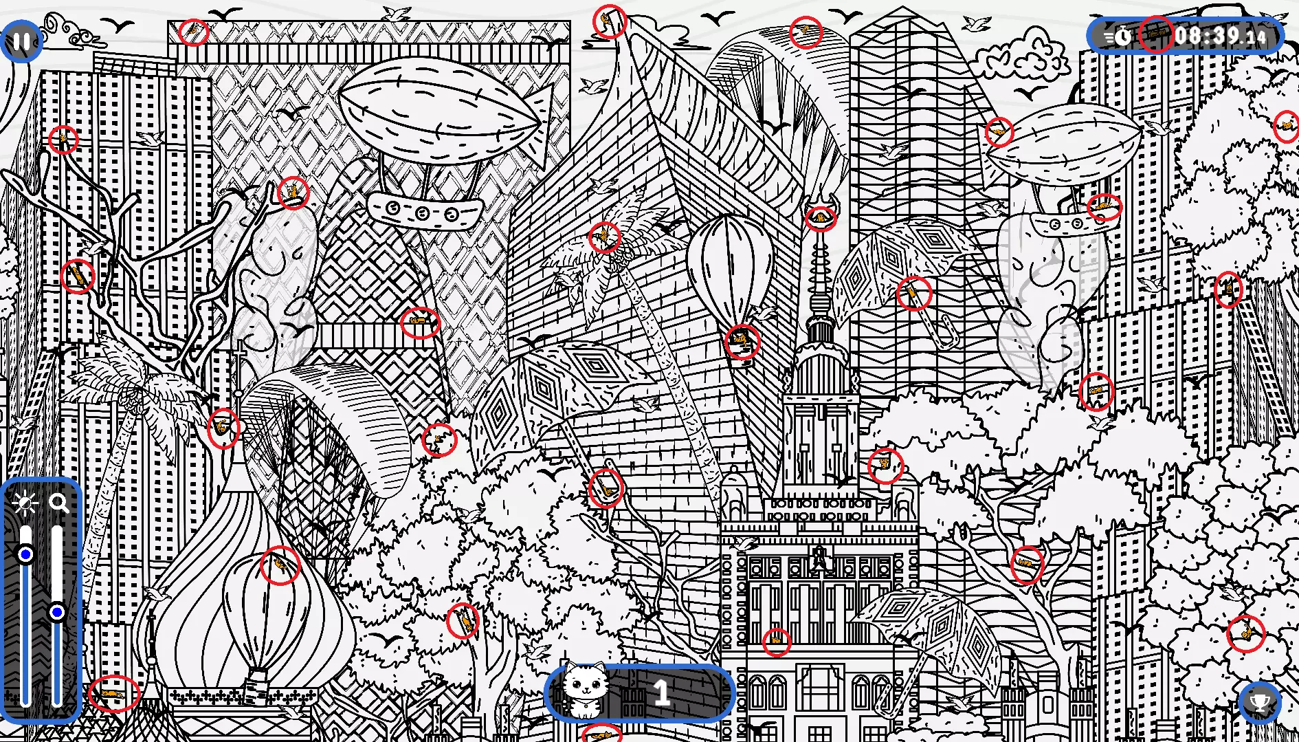 大家好, 本指南旨在帮助大家找到所有隐藏的猫咪。有些猫咪很难被发现,所以如果你在寻找遗漏的猫咪以完成游戏,欢迎使用本指南或参考一下。保证能达成100%成就! 祝玩得开心! 猫咪的所有位置 注意: 1) 最后一只猫咪在绿色圆圈内。 2) 请注意,有些猫咪隐藏在用户界面和计数条后面。它们也被圈出来了。 左侧