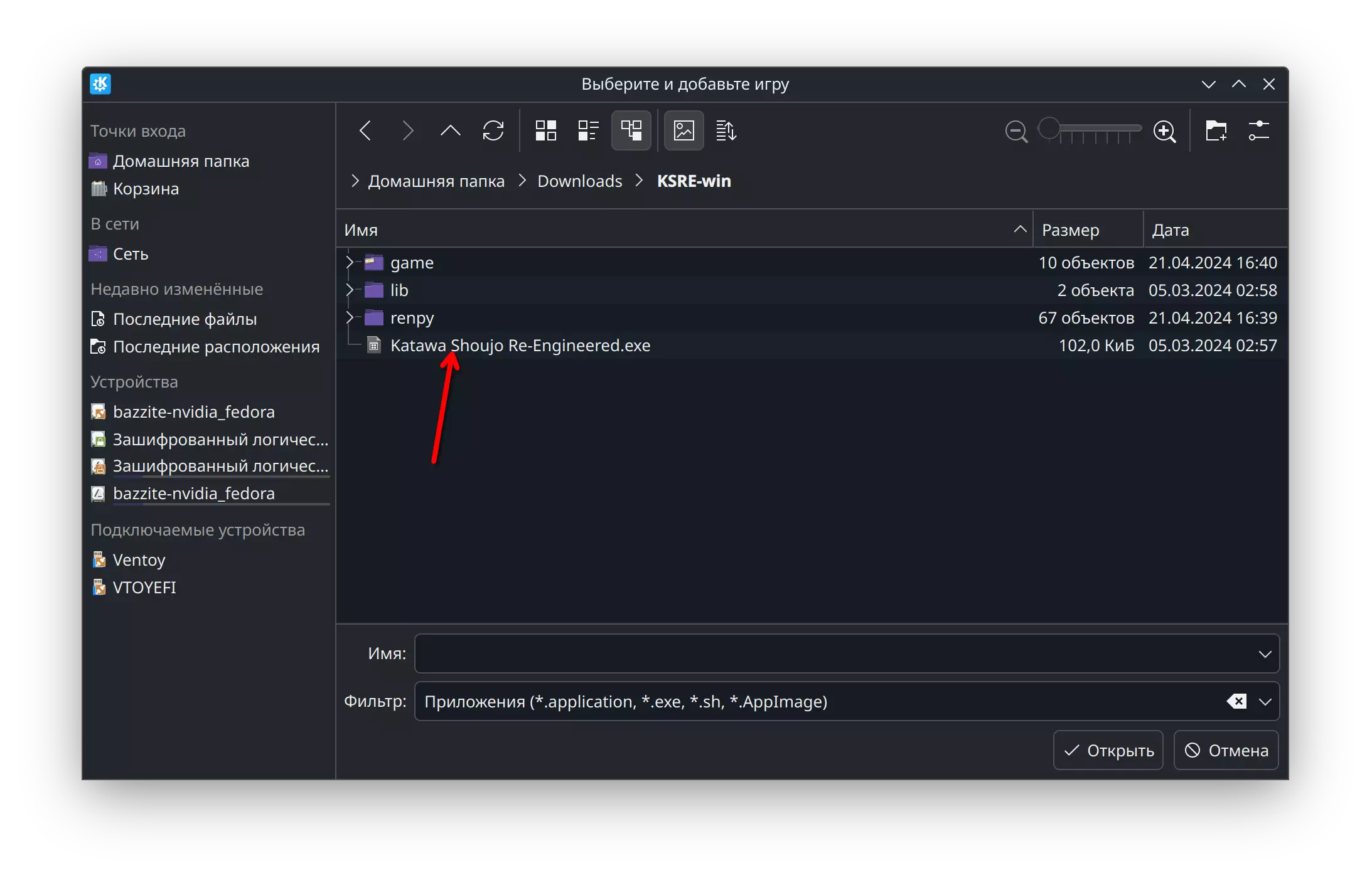 “这简直太糟糕了,到底要多少次啊!”奥列格·尤里耶维奇大喊一声,然后把游戏关掉了。 在本指南中,我会告诉你如何安装名为【Katawa Shoujo: Re-Engineered】的《 katawa shoujo 》增强版,这个版本包含以下内容: 内置俄语 全面支持Steam Deck和手柄(现在不用离开沙发就能攻略静流了!)残疾功能支持(想想看,一款关于残障人士的游戏,默认情况下残障人士自己却无法游玩) Discord集成(向你的朋友们展示你对视觉小说的了解) Android和iOS版本(因为把衣柜里的场景瞒着妈妈藏起来是最容易的) FullHD 16:9图像分辨率 各种视差之类的视觉效果 自定义模组框架和开放源代码(Steam的创意工坊至今未引入,而这里你不需要)需要和重新打包者一起制作自己的米琪根文件!还有一个活跃的国际社区,其中也包括俄语技术支持。感兴趣吗?好的,开始安装……在电脑上安装《Katawa Shoujo》:Re-Engineered,并尽可能整合到Steam中。那么,要下载游戏的话,前往指定网站。页面是英文的,但所有针对不同操作系统的不同版本按钮都在顶部,总体来说各个版本的位置还是比较清楚的。对于Windows系统,你下载的压缩包名称会是KSRE-win.zip。 将压缩包解压到任意你喜欢的文件夹,但要确保妈妈不会发现你在和那些有特殊情况的女孩们玩游戏。《Katawa Shoujo》重制版与原版游戏及Steam上的安装版本并无关联,因此可以同时安装这两款游戏。存档也不会相互冲突或导入(至少目前是这样)。 要将游戏添加到Steam中,请执行以下步骤: 1. 打开库页面,点击底部的【添加游戏】。