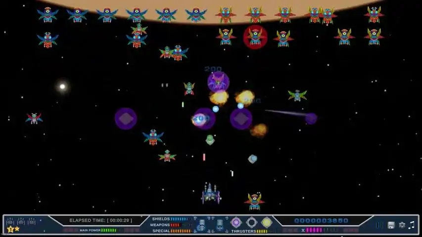 “一个未知的外星种族刚刚对阿尔法地球站发动了一次失败的攻击,目前正在火星附近重新集结!空间站成功击退了这一波攻击——但传感器显示有多支敌方舰队正进入该星系。阿尔法地球站无法同时抵御所有敌方舰船!” “现在,这取决于你了。击退来袭的舰队,找出他们舰船的建造地点,并发动一次总攻,一劳永逸地终结他们的攻击!如果阿尔法地球站被摧毁,地球将沦陷,人类也将灭绝。” 游戏玩法 游戏分为三个章节: 太阳系、星际空间和维斯普斯星系。每个章节包含六个关卡(融合太空侵略者风格的太空战斗和危险关卡),并以一场首领战结束。太空战斗关卡中包含多种特定类型的敌方飞船,每种飞船都有其独特的行为模式(详情见敌人部分)。 提示:你的飞船敏捷灵活,但推进器能量并非无限,因此请明智规划你的机动! 敌方火力会损坏你的护盾,但不如物理碰撞造成的伤害大,所以尽量不要撞到任何东西。 不要让裂隙者打开太多传送门!太空战斗关卡开始时敌人数量是固定的,但如果不及时处理裂隙者,敌人数量会迅速增加。优先摧毁它们是你唯一的希望! 母舰拥有充满敌方飞船的发射舱,其中包括裂隙者。摧毁母舰以阻止更多裂隙者进入战场,并在裂隙者开启传送门之前消灭它们。 能量平衡道具允许你将当前未使用系统的能量转移到其他可能能量不足的系统。例如,当无敌状态激活时,你的护盾无需使用,多余的能量可以分配给其他系统。 奖励道具 能量彩色能量球可充能你的系统:主能源、护盾、武器、特殊武器