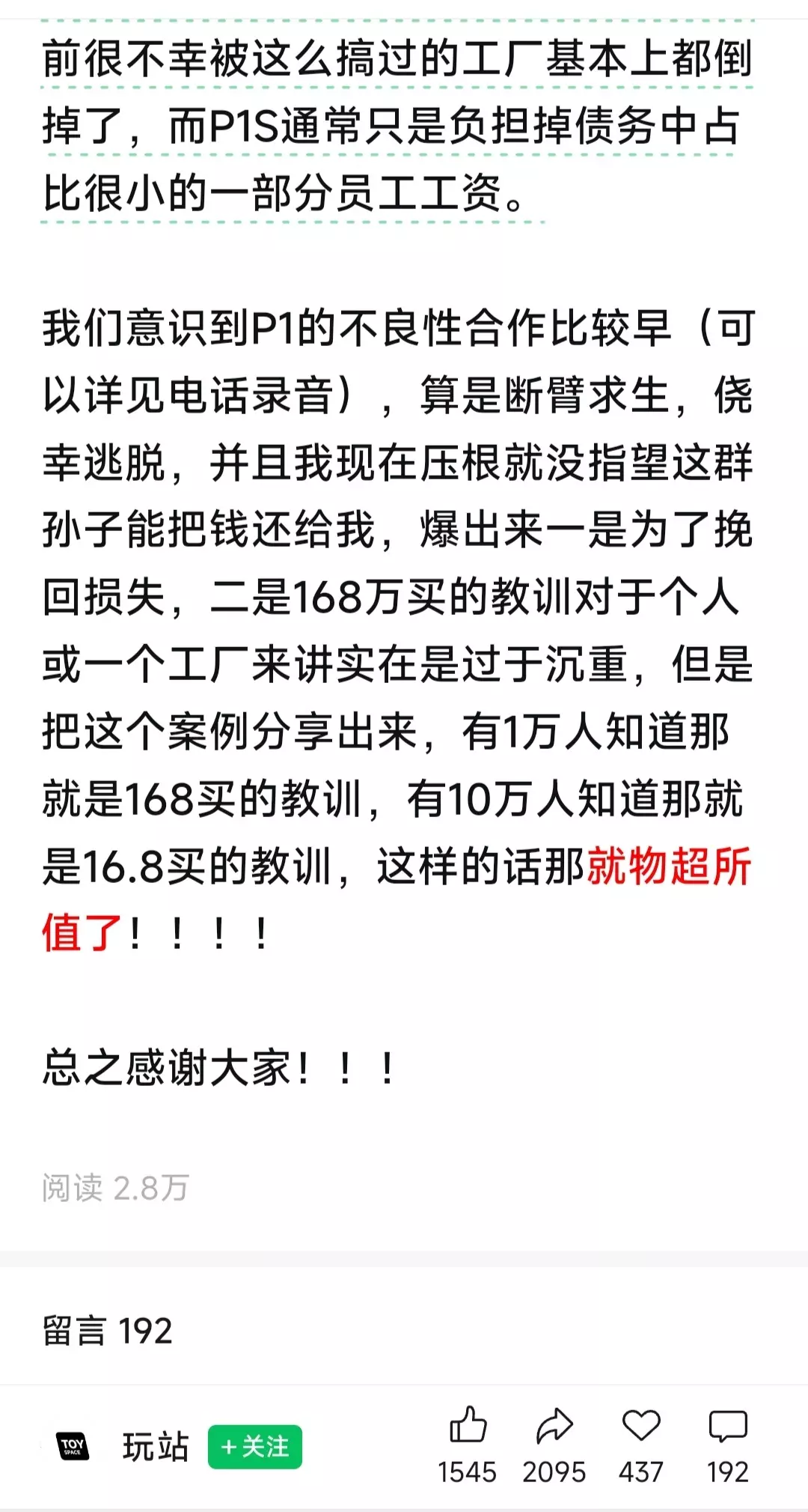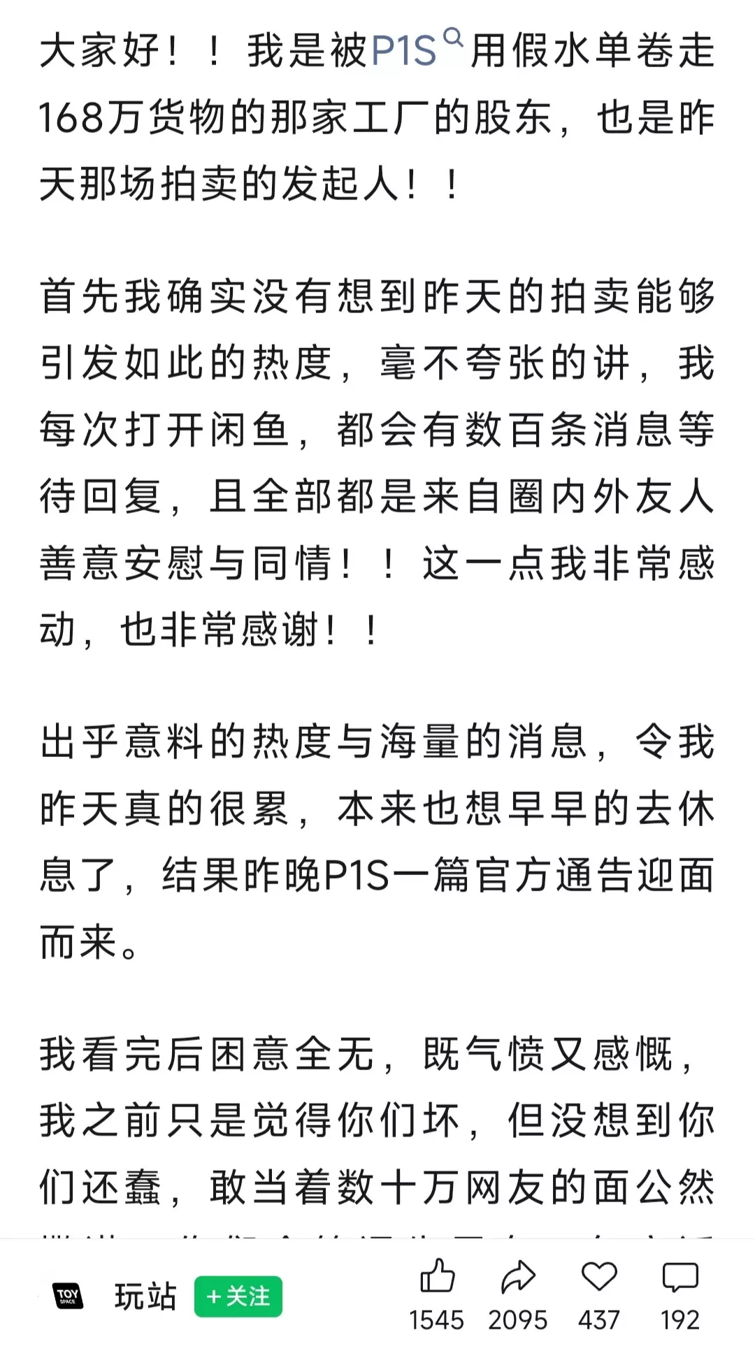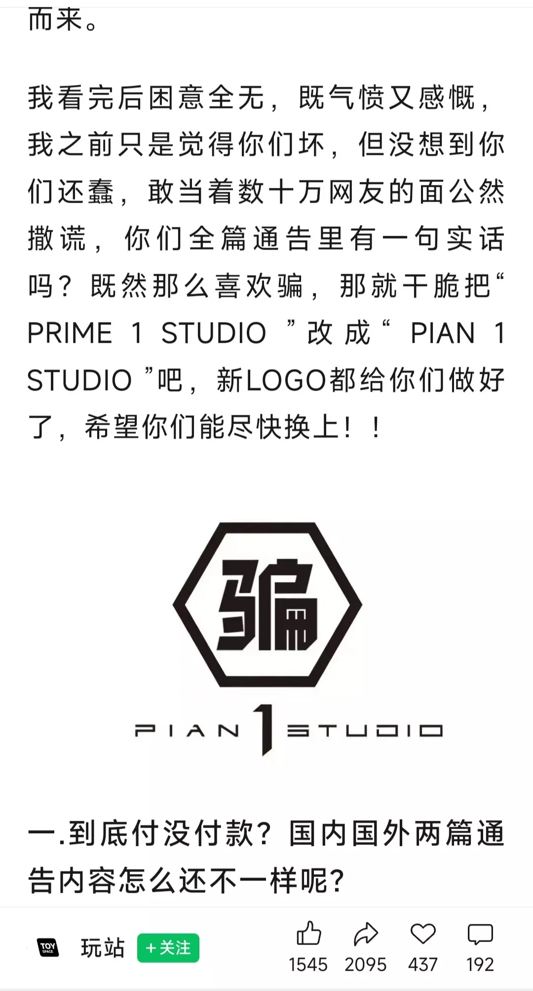 雕像圈大瓜:P1S拖欠代工厂168万货款 今天晚上,Prime1Studio官方在国内WB上,又发布了新的通告... (昨天P1S发的通告说无直接法律关系,最新通告又说存在合作关系...) 尾款为何拉货后不到,还是只字不提... (工厂那边都已经贴证据了...想了解事件详细内容的,可以去搜GZH【玩站】)