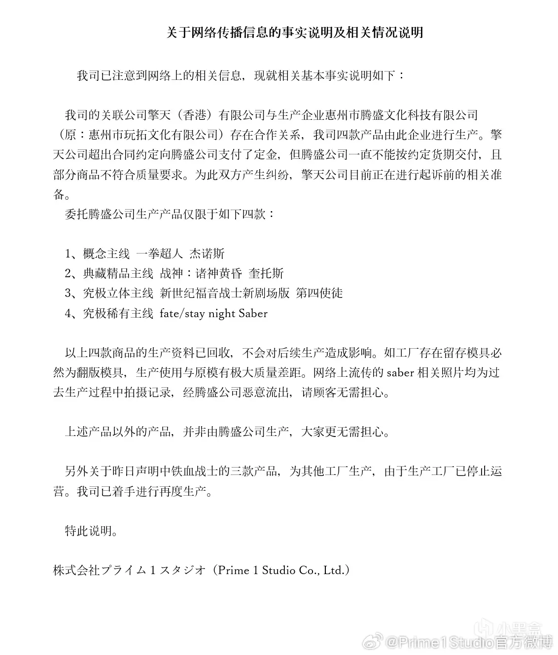 Prime1Studio官方在WB上发的最新通告