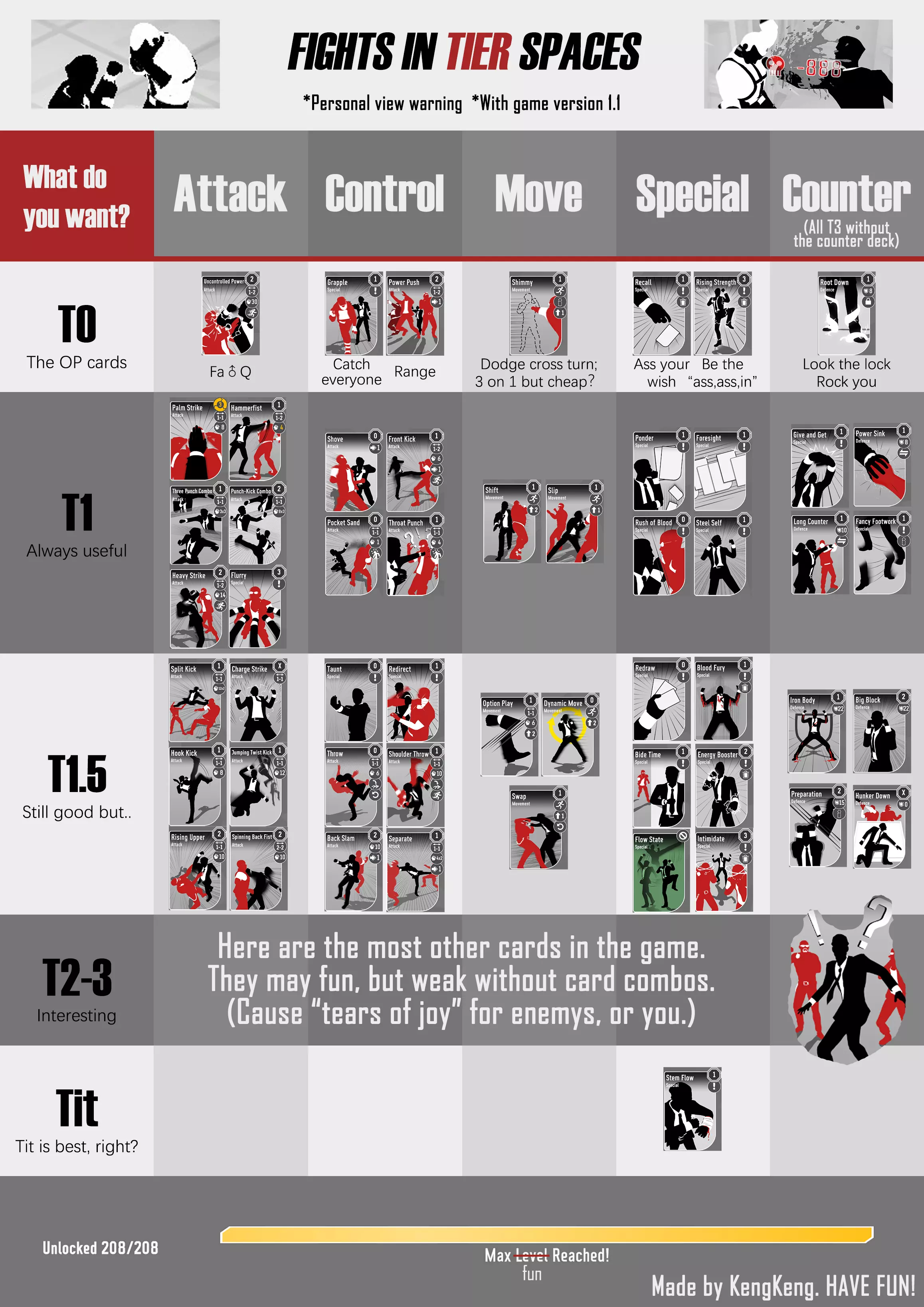 这是用循环套打出的20亿伤害~ 反击套现在是T3级别了哈哈 一套流畅的卡组应保留12至20张卡牌,其中包括: 2至4张移动牌 3至5张控制牌 3至7张特殊牌 其余为攻击牌。但要记住:任何单卡都不应放入超过2张。 一些bug报告 【摇摆】可以跨回合保留闪避效果。(请不要修复!把它正式化吧!) 【摇摆】被视为攻击牌,会消耗【钢铁意志】的充能。 如果在本回合使用了回滚,那么在最后一回合打出的【掌击】将不会提升攻击力。 如果在本回合使用了回滚,有时【转身敌人】会忽略【擒拿】的转身效果。