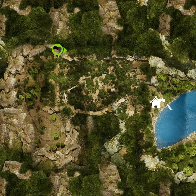 北部湖泊 从你家出发有一条徒步小径,沿着它走。一直靠左侧行进。很快小路会开始上坡,当你向上攀登时,右手边会出现岩石,向那些岩石走去。