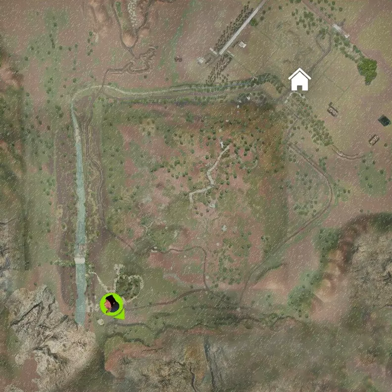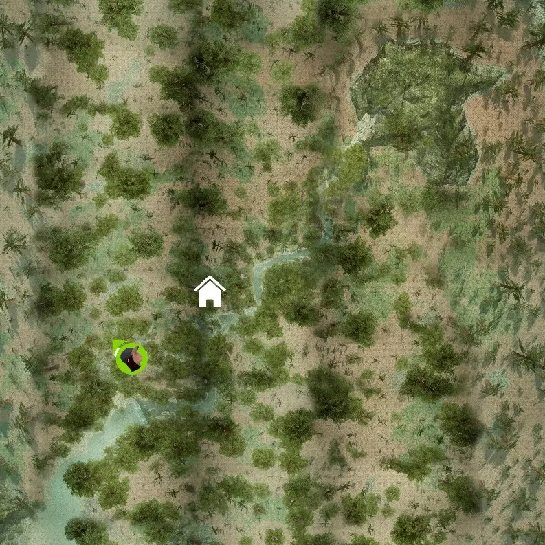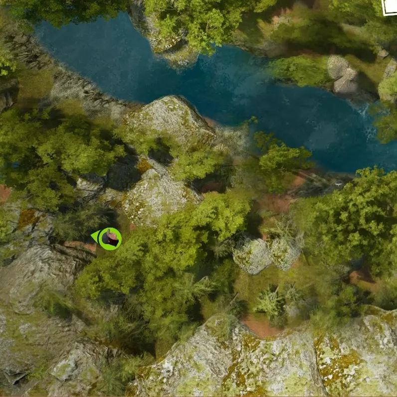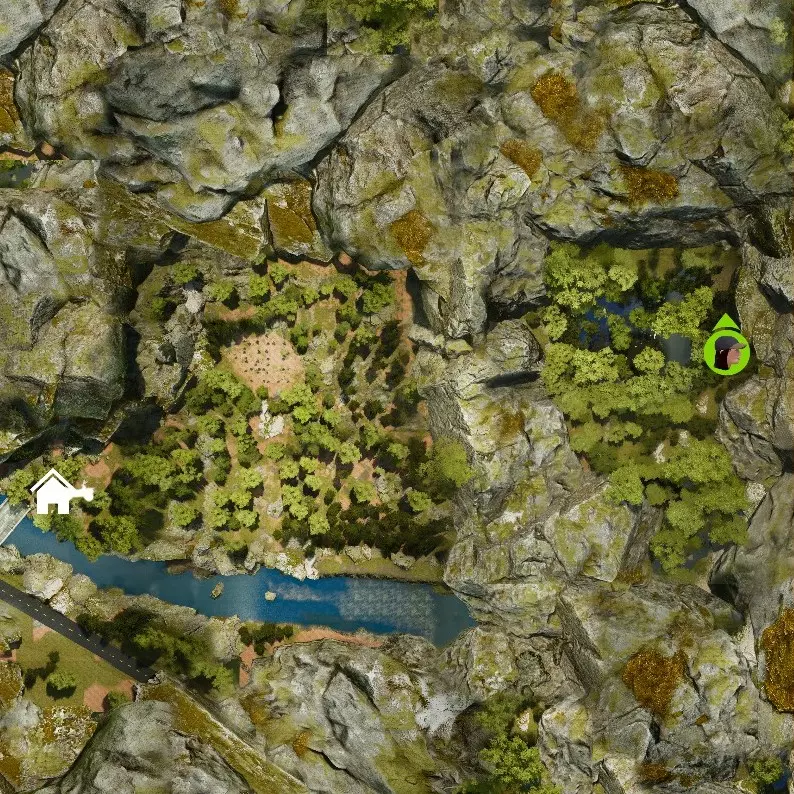 红木林 离开帐篷后,向西南方向移动,将帐篷甩在身后。很快你会看到一个峡谷,下到峡谷里,那里长着蘑菇,还生活着一只蝾螈。峡谷会把你引向河岸。