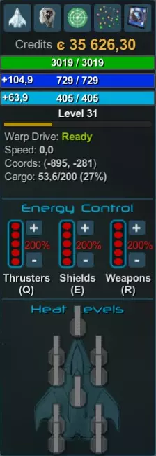 绿色条是你的【护甲】,相当于其他游戏中的生命值。如果它归0,你就会死亡! 其下方的深蓝色条是你的【能量】。左侧数字显示你的飞船反应堆每秒产生的能量值(EPS)。添加更多反应堆可提高EPS,而添加更多耗能设备则会降低EPS。中间的数值是你的【能量储备】,即电池容量。当你开火或被敌人的离子武器击中时,电池会消耗。若电池归0,你将无法使用武器、速度提升、牵引光束及其他设备。 浅蓝色条是你的【护盾】,相当于第二生命值条。左侧数字显示你的【护盾再生】速率。护盾即使在受到攻击时也会自动再生,但一旦护盾值降至0,再生就会停止,你需要在短时间内不再受到攻击,护盾再生功能才会恢复。 能量控制部分显示你为各个系统分配的能量值。例如,若将护盾功率设为200%,护盾发生器提供的加成效果会翻倍,但同时消耗的能量也会翻倍。 最后,热量等级部分显示飞船每个武器安装点积累的热量。开火时,热量条会填充,颜色从绿色变为黄色,再变为红色。当热量条充满时,安装点会开始闪红。闪烁的红色表示过热,武器将无法使用,直至热量消散。 扫描仪窗口:与常规小地图不同,扫描仪窗口会根据扫描仪功率变化。扫描仪功率越高,小地图缩放程度越大,可观测的范围也越远。高扫描仪功率能让你远距离发现其他飞船和漂浮的战利品。 星图:按M键打开。