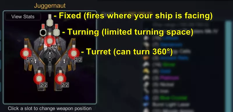 武器空间十分重要。教程飞船的武器空间为3,这意味着你最多可以安装3个基础采矿激光(因为它们的空间需求为1),或者安装1个空间需求为3的武器。 武器挂载点是飞船上用于安装武器的物理位置,武器将从飞船上的这些特定位置开火。你可以在机库中查看当前飞船的武器挂载点。 武器挂载点有以下类型: