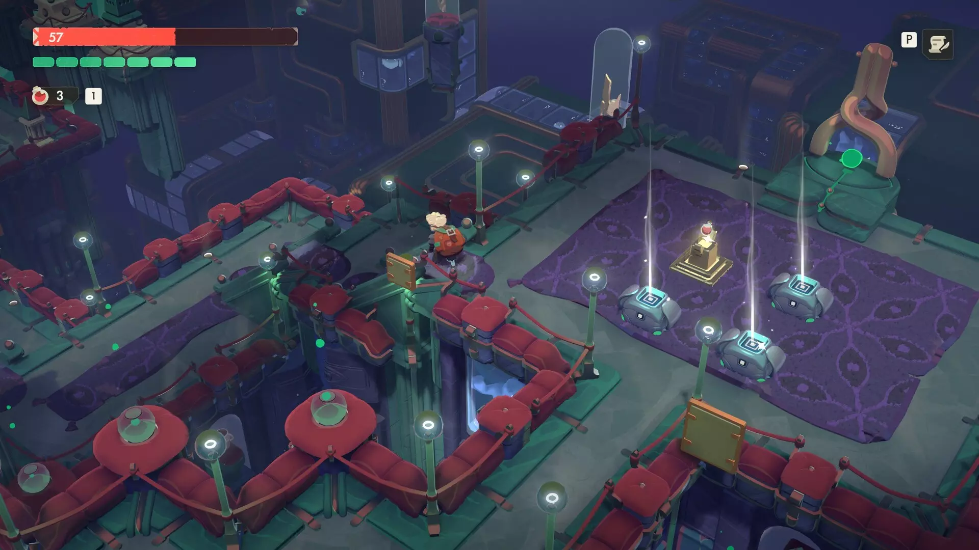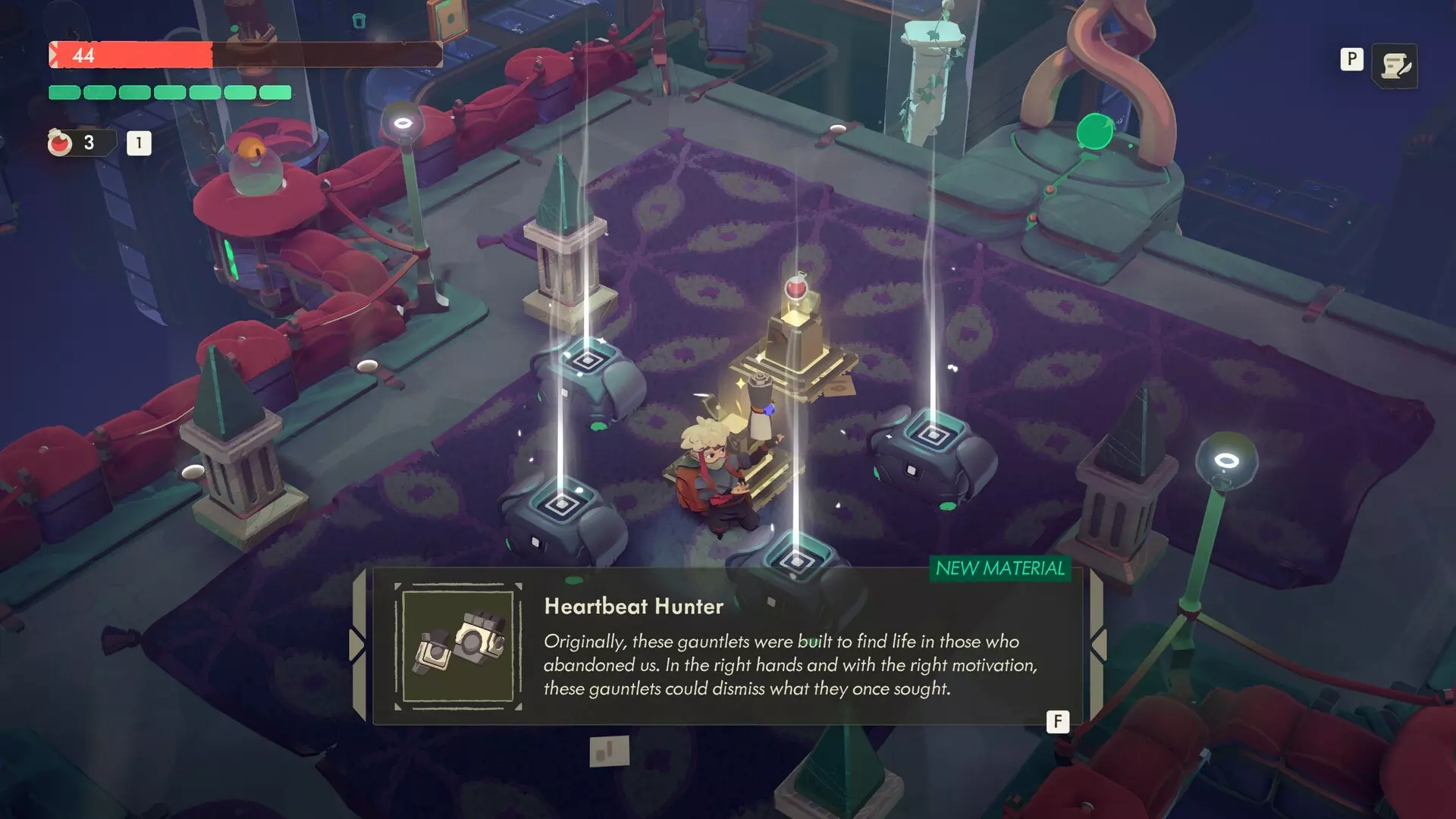 激光束沿固定路径移动,只能通过闪避翻滚来躲避。 到达终点后,与讲台上的悬浮卷轴互动,即可获得【心跳猎手】的制作配方。