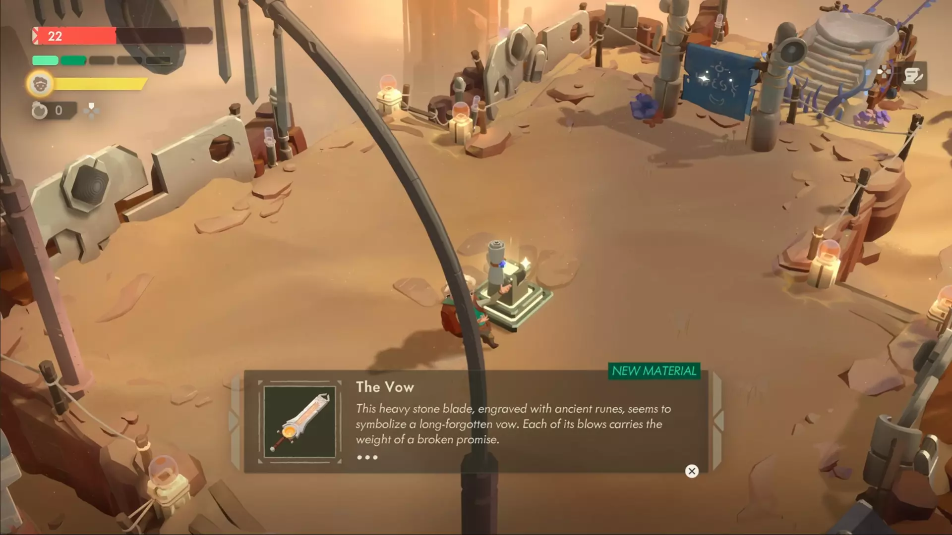 穿过传送门,进入一个布满陷阱的隐藏房间,你必须躲避这些陷阱。你会遇到各种各样的陷阱,比如如果你在上面停留超过一秒就会闭合的捕熊夹,以及能把商人直接从平台上吹下去的强力巨型风扇。 到达终点后,与讲台上的悬浮卷轴互动,即可获得【誓言】巨剑的配方。