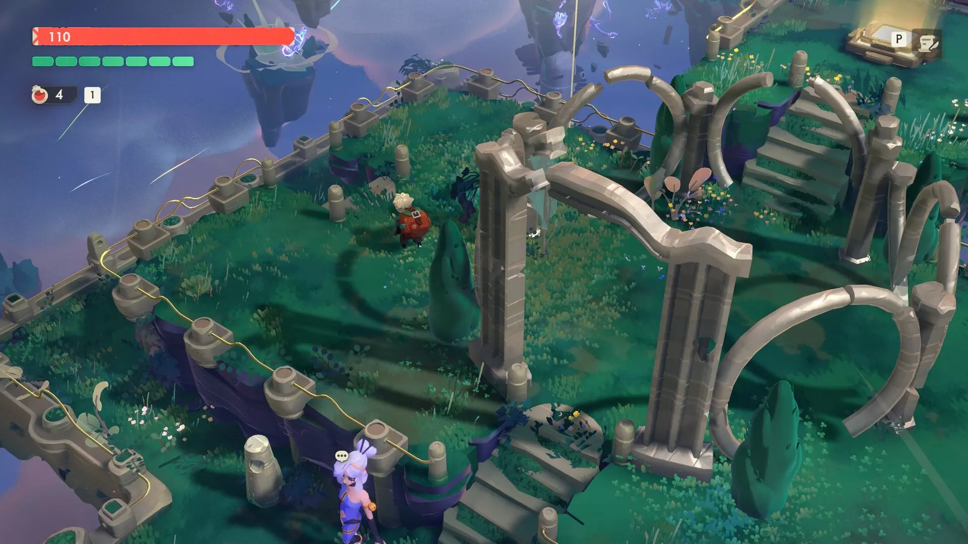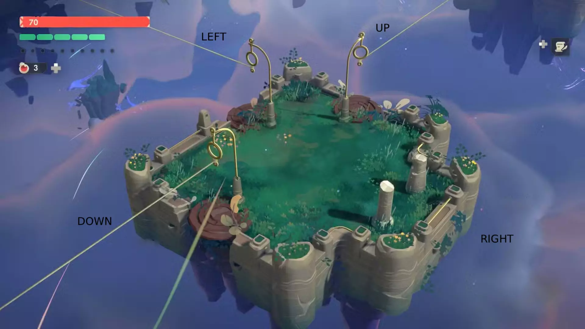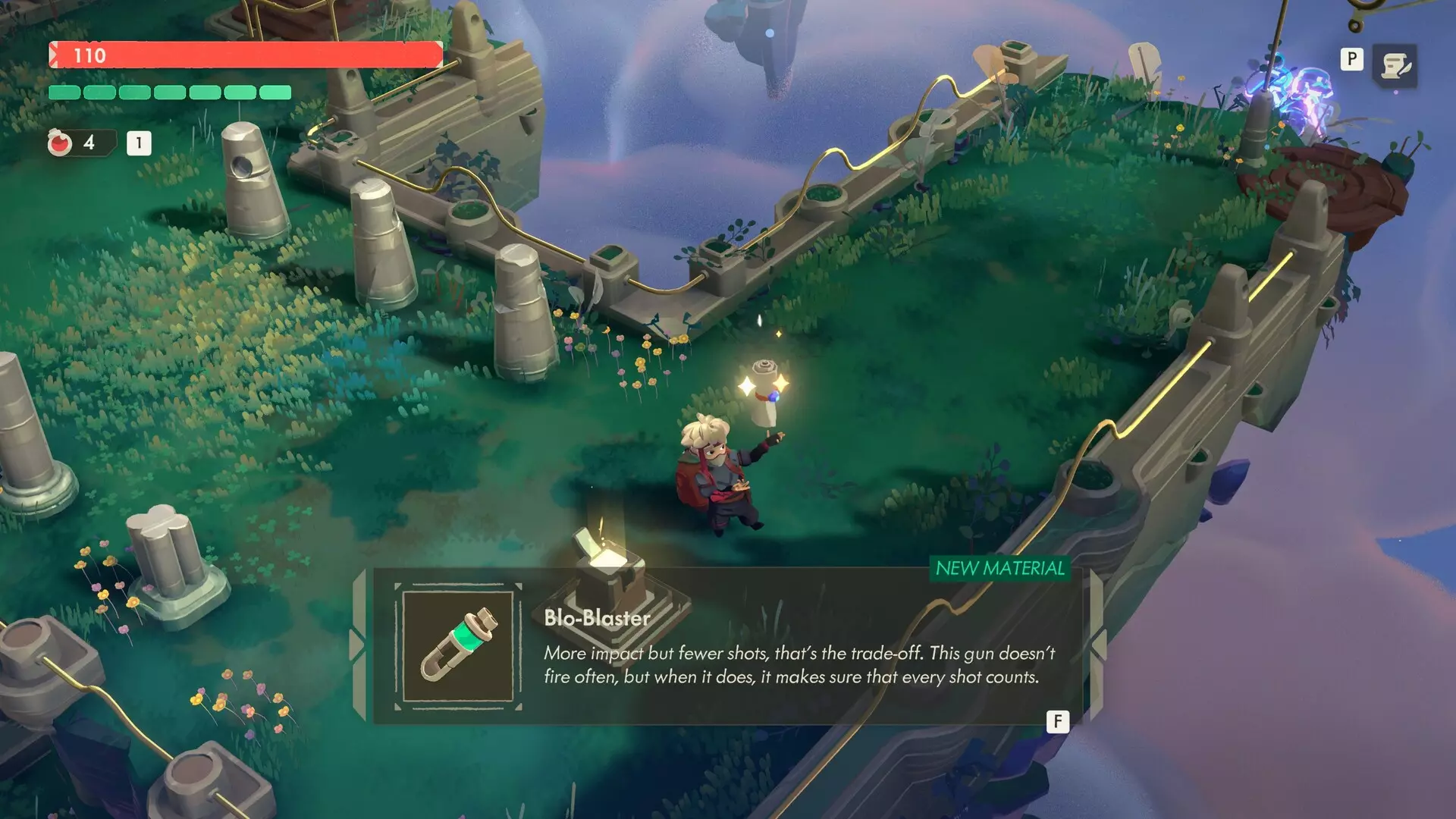 根据上图,你可以向以下方向移动:上、下、左或右。 到达迷宫起始岛屿的卷轴的正确顺序如下: 下、右、右、上、左、上、左(使用滑索到达较低的平台)、下、左 沿着这条路径前进,你将找到包含布洛冲击波枪配方的卷轴。