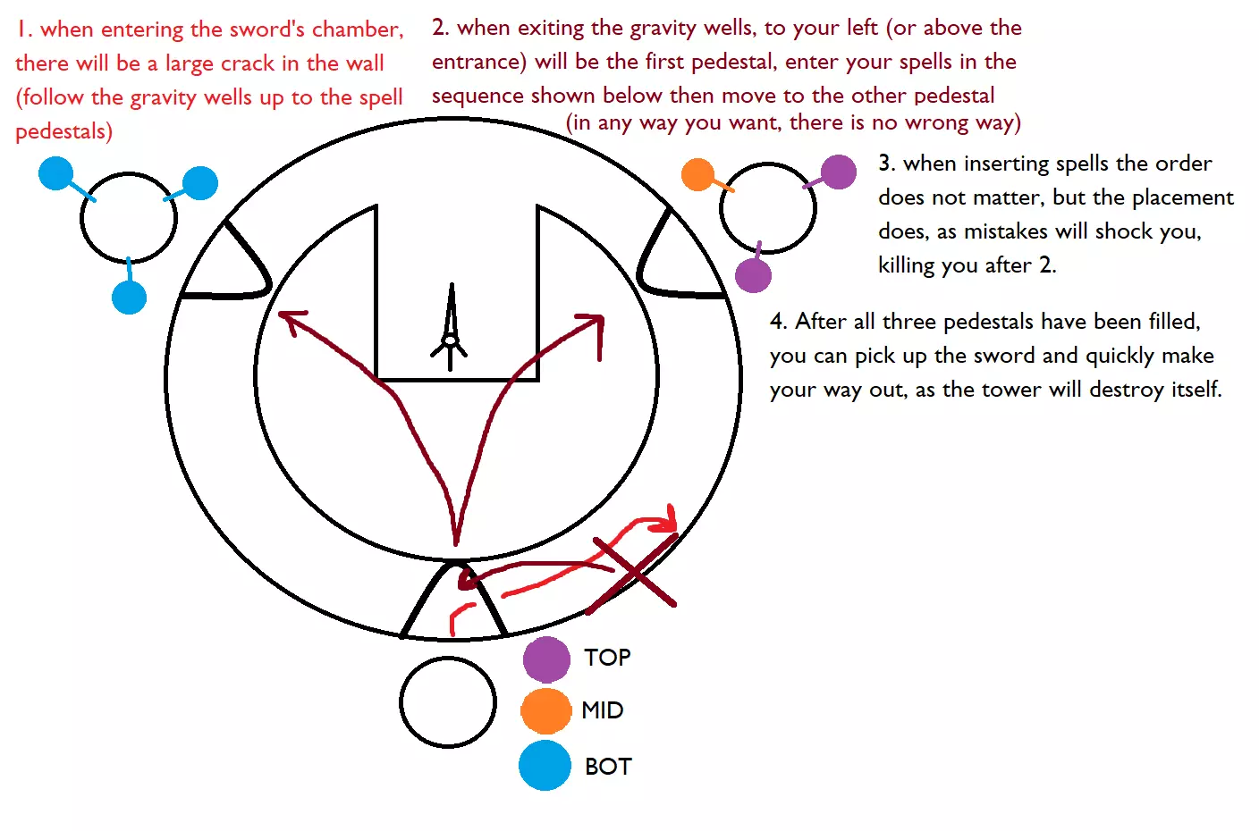 路径已按步骤进行颜色编码,但按照指南操作时应该能自行理解。 我的做法: 我按顺时针顺序启动基座,从入口开始: 1. 入口上方(重力、火焰、电力) 2. 左侧(全电力) 3. 再向左(左侧为火焰,其余为重力) 在基座之间移动时,我利用重力跳跃并漂浮到每个基座,这让过程变得非常简单。 启动所有基座后,我只需拿起剑,漂浮出主 chamber,在塔倒塌前跑了出来。