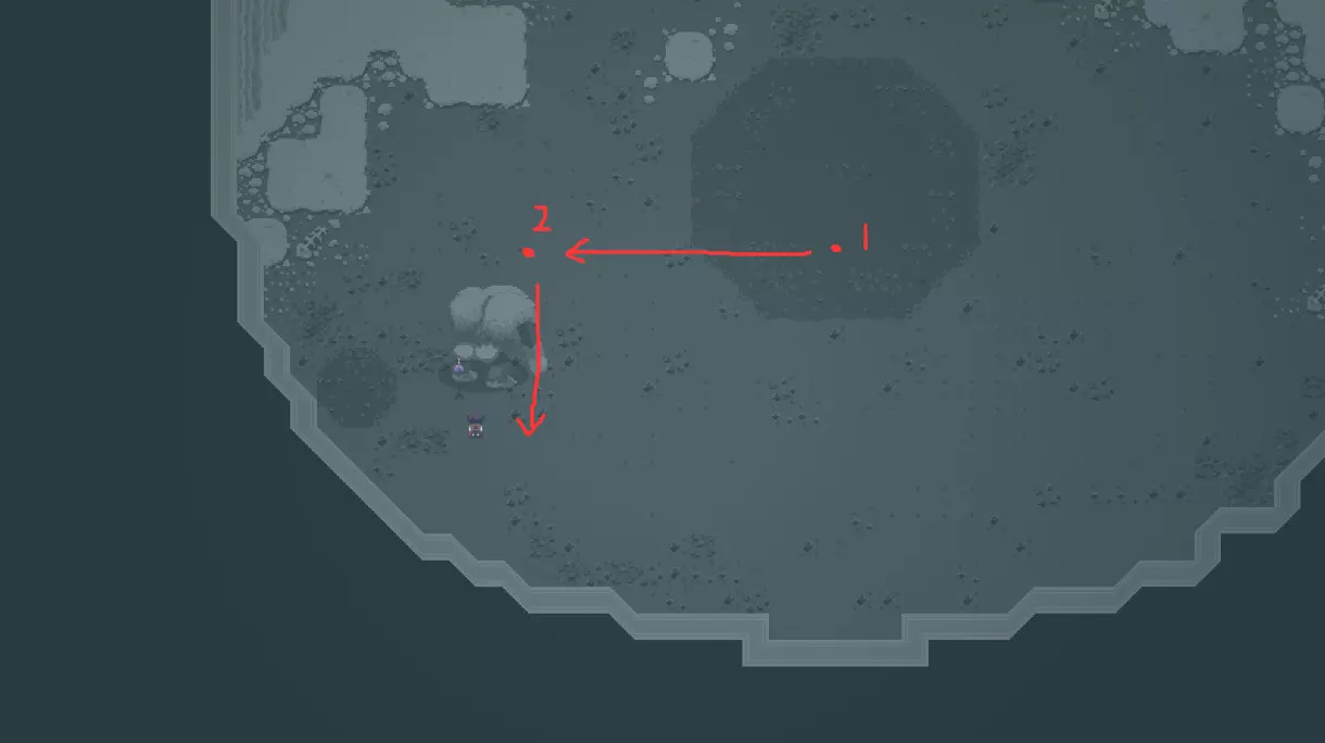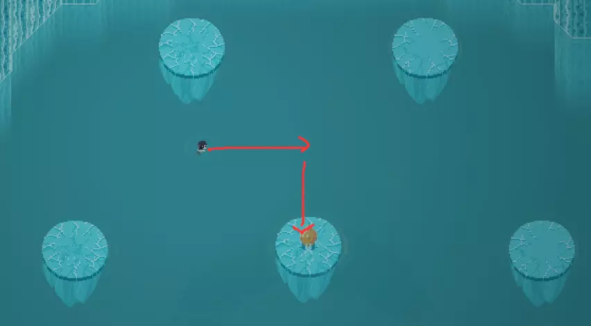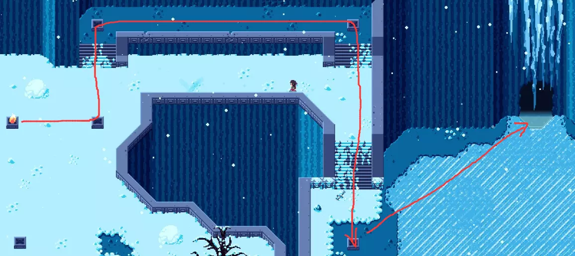 第二部分 雪人 YETI 特点: 先放出四个不致命的雪球,之后进行翻滚 会随机落下冰锥 普通难度: 按下图的路线移动,在1处射箭并收回后向右行走,躲开4个雪球后在2位置向下滚动。此时雪人翻滚撞墙后会差不多落到上方位置,需要在其翻滚尚未停下时迅速拉弓,否则它会马上进行第二次翻滚。多尝试几次即可。