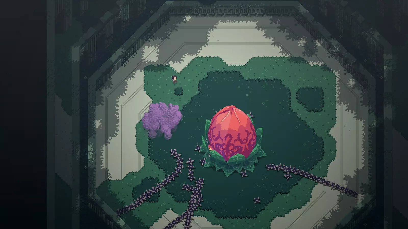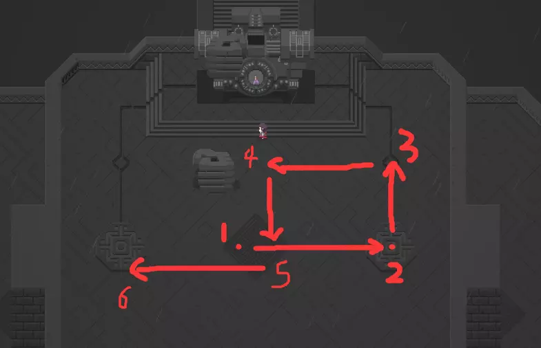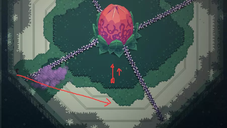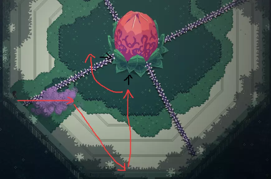 先站在门口往上射一箭,趁门没关时翻滚出去,然后跑到上面寻找时机收回箭矢即可。(箭矢要离远一些,图中只是示例,多尝试几次就行。 第二部分 毒花【VINETHESIS】 进入方法: 右、左、上 特点: 会释放毒气,接触时间过长会致命 会生长出带刺藤条,可用箭射断 普通难度: 唤醒Boss后向左翻滚,到达图示位置,当毒气扩散过来时,藤条也差不多要开始逆时针转动,此时朝着箭头方向跑到花嘴的正下方,用弓箭射击,Boss会露出弱点。随后尽快往左上方移动,再向右对着花瓣射箭,即可击杀Boss。需要多加练习,难度不算高。(抱歉我懒得再截图了Orz)
