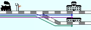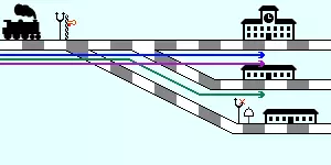 站台选择信号,或简称选择信号,可用于让列车在车站自动选择空闲站台。当列车到达选择信号处时,会先检查其时刻表中选定的站台以及前往该站台的路线是否空闲。若不空闲,列车会检查所有其他站台是否有可用的(站台及前往该站台的路线),并改用该站台。如果没有可用的替代站台,列车会在信号处等待,直到时刻表中的站台空闲,且不会再尝试前往其他站台。注意不要出现站台可达但需要绕行很长距离的情况。火车不够智能,无法识别这种情况,只要能到达站台,它们就可能绕着地图往返行驶。另外,如果并非所有火车都会在某个贯通式车站停靠,切勿在该车站设置选择信号机。火车会将其理解为通往目的地的选择信号机,无论目的地有多远。如果火车没有立即停滞,它会预留通往目的地的整条路线,从而阻止其他火车使用该路线。这种情况通常不会导致死锁,因此甚至可能不会有火车停滞的提示。