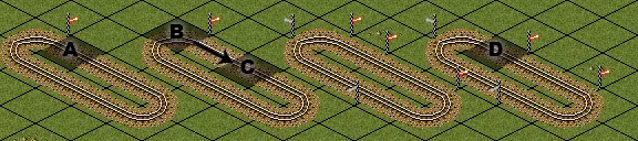 信号间距默认为2,即每2格放置一个信号。这使得列车能够以仅2格的间距连续行驶。由于通常不需要如此密集的连续行驶,且每个信号都需要花费一定的【游戏货币】,因此尤其在游戏初期,建议使用更大的间距。你可以选择移除中间信号或替换其他信号。第一个选项会移除新放置信号之间间隙中的所有信号,第二个选项会替换恰好位于新信号放置位置的现有信号。通常最好同时启用这两个选项。当你通过拖拽放置信号时,所有信号均为你拖拽方向的单向信号。但你无法拖拽经过反方向的单向信号。这有一个小技巧: 铺设两条平行轨道并在两端连接。放置一个单向信号灯来指示你希望信号灯的放置方向(A),然后从单向信号灯后方的格子(B)拖动到信号灯前方的格子(C),以在整条轨道上放置信号灯。最后,删除手动放置的那个信号灯(D)。