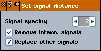 选择信号灯后,鼠标指针会发生变化,表明你现在可以放置信号灯了。 点击一段轨道来放置信号灯。你不能在交叉路口或已设有其他信号灯的轨道段上放置信号灯。对于大多数信号灯,放置后你会看到轨道两侧各有一个信号灯。这被称为双向信号灯,因为它在两个方向上的作用相同。如果你持续点击,首先会出现单向信号灯,然后再次变为双向信号灯。单向信号灯仅在一个方向上工作,同时会阻挡另一个方向的所有交通。 你也可以通过拖动操作一次性沿轨道放置多个信号灯。要执行此操作,按住控制键并点击信号灯,会打开一个名为【设置信号灯间距】的窗口。