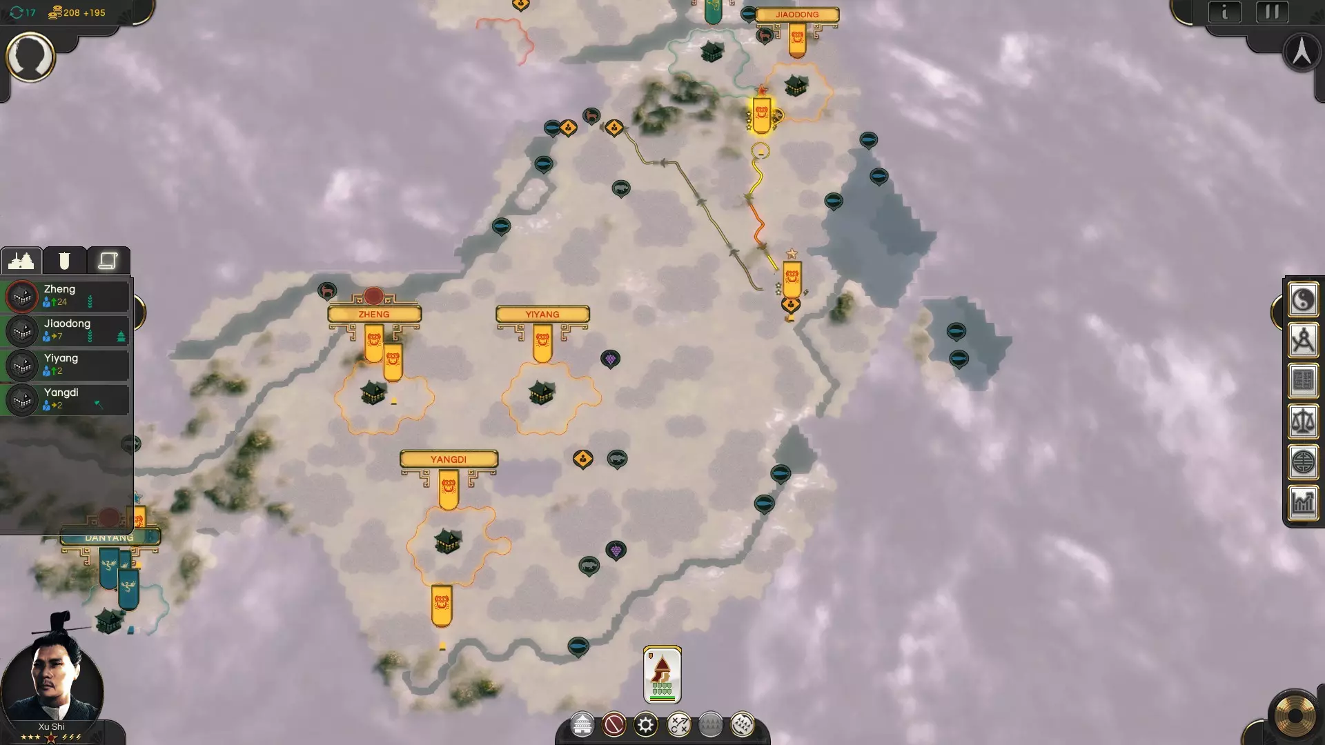 本指南将帮助你了解《东方帝国》的部分独特机制。建议结合游戏内的介绍文本一同使用。 1. 欢迎 欢迎阅读《东方帝国》快速入门指南。本指南将涵盖游戏中一些最重要的机制和特色。不过,许多内容不会在这里涉及,但你总能通过游戏内百科找到关于特定游戏内容的更多信息。游戏内也对操作方法有很好的说明,因此本指南将重点解释“为什么这么做”。 《东方帝国》是一款回合制4X策略游戏,你可以在其中控制古代中国的多个主要势力/氏族之一。你将带领选定的氏族历经3000年历史,建立新城市,发展新技术,并与对手展开战争。 2. 开始游戏 2.1 设置游戏 开始新游戏时,你首先需要在【宏大战役】和【自定义游戏】之间进行选择。宏大战役更具历史感,发生在精确的古代中国地图上。所有派系也将根据其历史地理位置拥有固定的起始位置。选择自定义地图时,你可以根据自己的偏好生成地图。对于初次游玩的玩家,建议从【大型战役】开始,这样能确保更平衡的开局,并且在遭遇其他势力前,你会有更多时间熟悉游戏机制。 接下来,你需要选择要游玩的势力。每个势力都有各自的加成和减益效果,所以尽量选择一个符合你偏好玩法的势力。初期你只能选择那些拥有最有利起始位置的势力,但之后你将能够解锁其他势力以进行更多挑战。