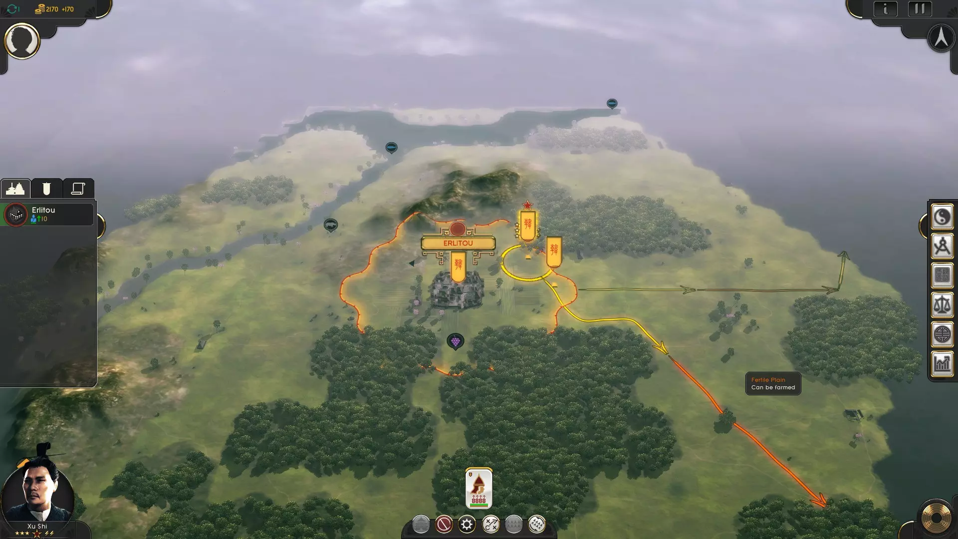 商和汉都是不错的初始势力。 2.2 开局行动 选择势力后,游戏便正式开始。你将从一座城镇(你的首都)、一支部队的重步兵(你的派系领袖)和一支部队的移民者开始游戏。移民者用于建立新的定居点,且在建立过程中会被消耗。 在你的第一次游玩时,会弹出建议,提示你下一个定居点的理想位置。一般来说,选择大片开阔且土地肥沃的区域,或者靠近大量自然资源(犀牛、铜矿、鱼类等)的区域都是不错的选择。 你可以通过左键点击旗帜来选择一支部队,右键点击目标地点即可下达移动指令。请注意,此时部队不会立即移动,而是会有一个箭头指示已接收到移动指令。只有当你结束回合后,所有指令才会实时处理,部队才会开始移动。 首先派遣你的移民去寻找新的肥沃土地,并命令你的派系领袖侦察周围环境。