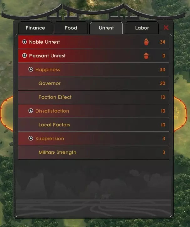 通过让民众耕种土地来增加人口规模是个不错的办法。 在城市管理界面中,你可以在4种不同的土地改良类型之间切换,以选择你想要的类型。接下来,你可以选择图标来排列它们的建造顺序。土地改良不需要花费金钱,但需要消耗劳动力,而这些劳动力本可以用于其他地方。 settlement名称左右两侧的按钮分别用于建造和招募。 3.3 动乱!中国古代历史充满了起义和反抗,这一点在游戏中也有所体现。在《东方帝国》中,人口分为农民和贵族两个阶层,在特定条件满足时,这两个阶层都可能发生叛乱。农民动乱可能有多种原因。点击城市管理面板中的图标,你可以查看这些原因的详细分类。作为玩家,你应该知道,命令农民修建过多公共工程等行为会让他们不满,因为这本质上是在使用强制劳动。因此,通常建议在一系列长时间的生产活动后让农民休息一下。其他降低不满度的方法包括提高帝国的文化等级以及派遣贵族驻军。 贵族也会有对玩家不满的理由,这通常与你的权威等级有关。权威等级决定了你对贵族的控制程度。它会随着科技发展和赢得战斗而提升,但输掉战斗或派系领袖死亡会使其大幅下降。此外,拥有的定居点数量超过权威值也会增加贵族叛乱度。