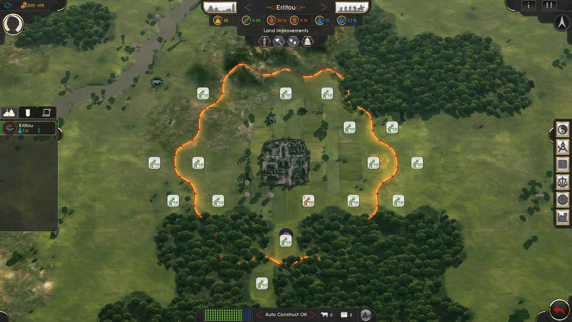 城市间的线条代表贸易路线。 3.2 城市管理 如前文所述,拥有庞大的人口十分重要。增加人口规模可以通过建立新定居点来实现,但过度建立可能会引发叛乱(参见3.3节)。另一种扩大定居点的方式是通过妥善的城市管理。 城市的人口容纳量受城市及周边土地的粮食产量限制。你可以通过先清理土地用于耕种,然后让民众在已清理的土地上实际耕种来提高粮食产量。 重要提示:当你命令民众建造新的公共设施或进行土地改良时,他们会转而从事这些工作,不再耕种土地,因此粮食产量会减少。在命令建造此类项目之前,让初始殖民地先发展一段时间通常是个不错的主意。