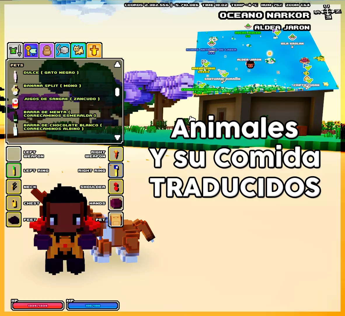 宠物及其食物已翻译 所有动物和敌对生物均已完全翻译,你也能找到每种用于驯服宠物的食物的完整翻译。 重要提示:每种宠物食物旁都标注了可驯服的宠物,这样你就不必频繁查阅指南了。
