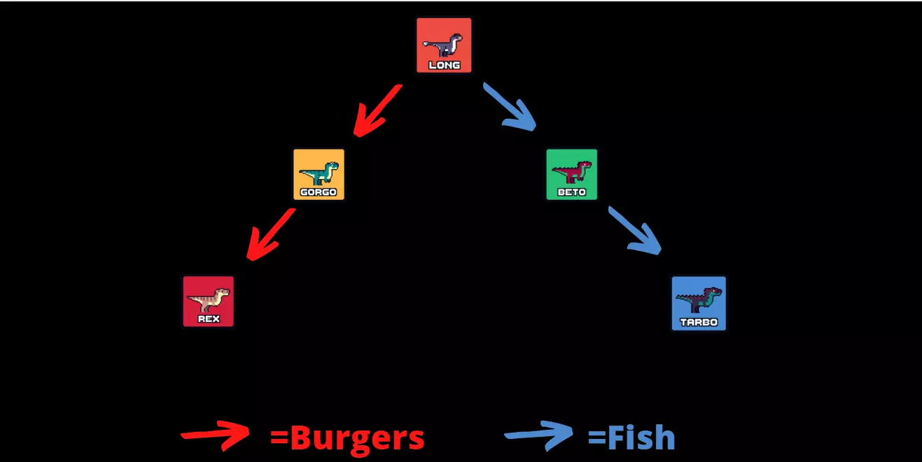 箭头颜色代表你应该给恐龙喂食哪种食物以获得想要的进化形态: - 绿色箭头表示你应该给恐龙喂食苹果 - 红色箭头表示你应该给恐龙喂食汉堡 - 蓝色箭头表示你应该给恐龙喂食鱼 补充说明:即使你喂食汉堡和鱼,原始恐龙也有几率进化为祖尼恐龙,开发者已对此进行了确认。不过在第二阶段,你无论如何都会获得犀牛恐龙和 Toro 恐龙。 国王蛋更新 随着此次更新,新增了一条进化路线,其逻辑与之前版本相同,以下是获取目标恐龙的方法: