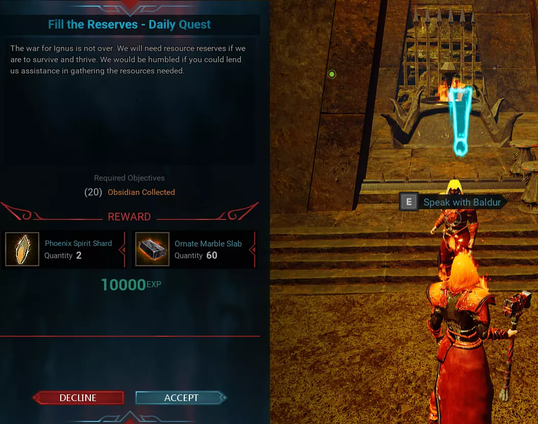 【龙之心地穴 - 巴尔德[每日任务]】 位置在N 3.26 - E 5.78,NPC名称为巴尔德。此任务每天只能完成一次。奖励和任务要求会每天自动更改。 更新:例如在巴尔德的这个任务中,要求收集20个黑曜石……这其实是个简单任务,但如果你在世界中找不到可采集的黑曜石或没有相关材料,我们发现可以通过按“L”打开任务日志,然后按“放弃”任务并重新接取来获取其他任务。任务可能会变为击杀10个骷髅,或者变为驯服1头麋鹿等其他内容。如果你无法完成某些任务,只需使用此方法即可从NPC处获取与最初接取不同的其他任务。