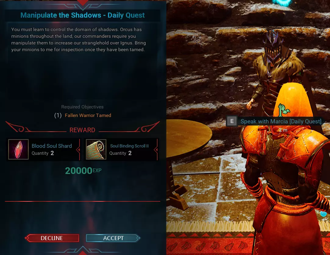 玛西亚【每日任务】 位置在N 5.07 - E 2.57,NPC名称为玛西亚。此任务每天只能完成一次。奖励和任务要求会每天自动更改。更新:例如在玛西亚的这个任务中,要求驯服1个堕落战士……我们发现可以通过按“L”打开任务日志,然后按“放弃”任务并重新接取任务来获取其他任务。任务可能会变为击杀10个骷髅,或者变为驯服1头麋鹿等其他内容。如果无法完成某些任务,只需使用此方法即可从NPC处获取与最初接取的任务不同的其他任务。