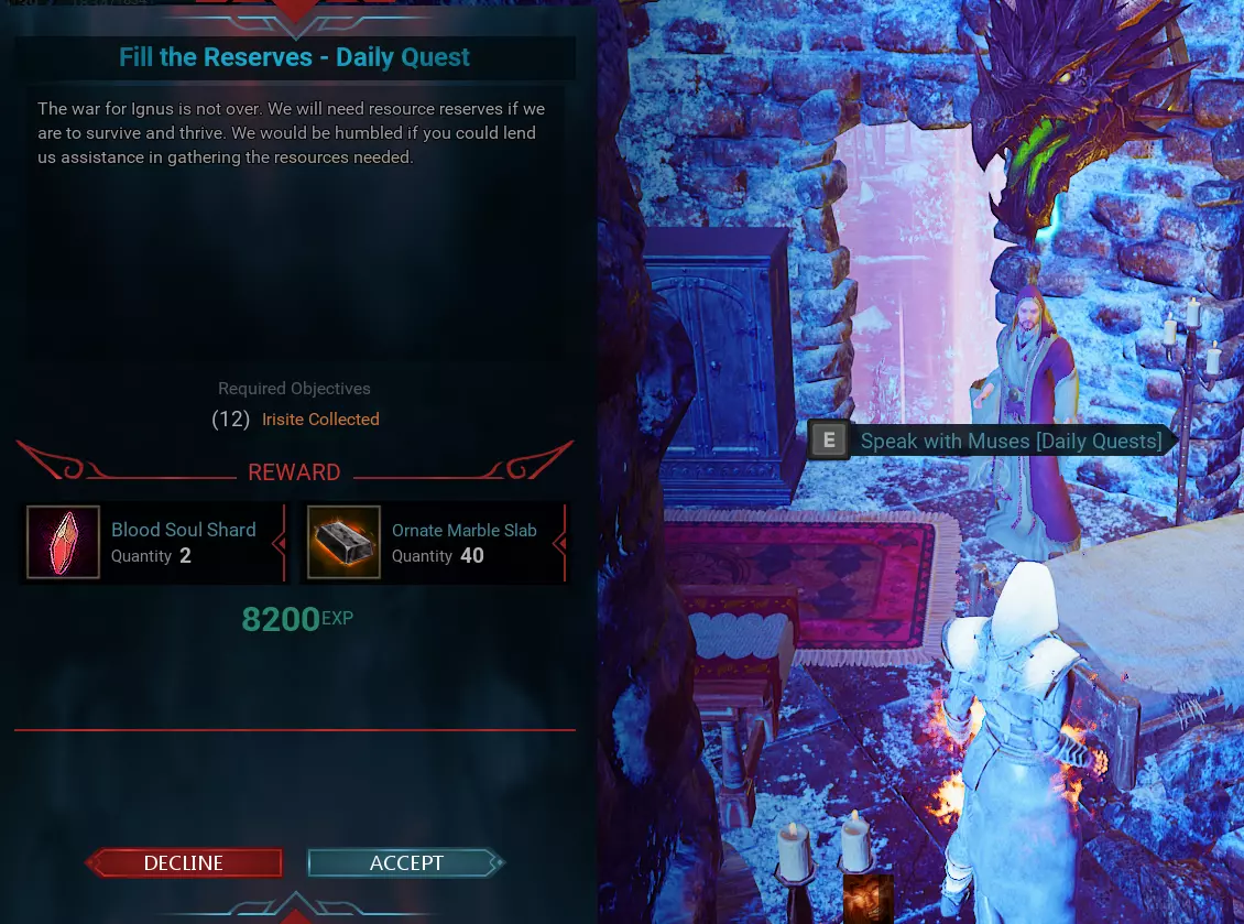 缪斯【每日任务】 任务地点位于北4.75 - 东1.54,NPC名称为缪斯。该任务每天只能完成一次。奖励和任务要求会每天自动更改。 更新:例如,在缪斯的这个收集12个艾瑞石的任务中,我们发现可以通过按下“L”键打开任务日志,然后点击“放弃”任务并重新接取,来获取其他任务。任务可能会变为击杀10个骷髅,或者变为驯服1头麋鹿等其他内容。如果无法完成某些任务,只需使用此方法即可从NPC处获取与最初接取的任务不同的其他任务。