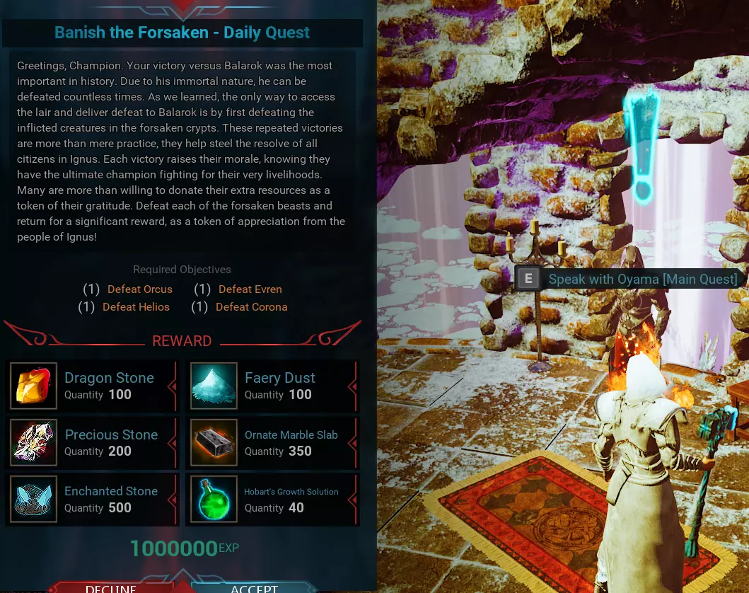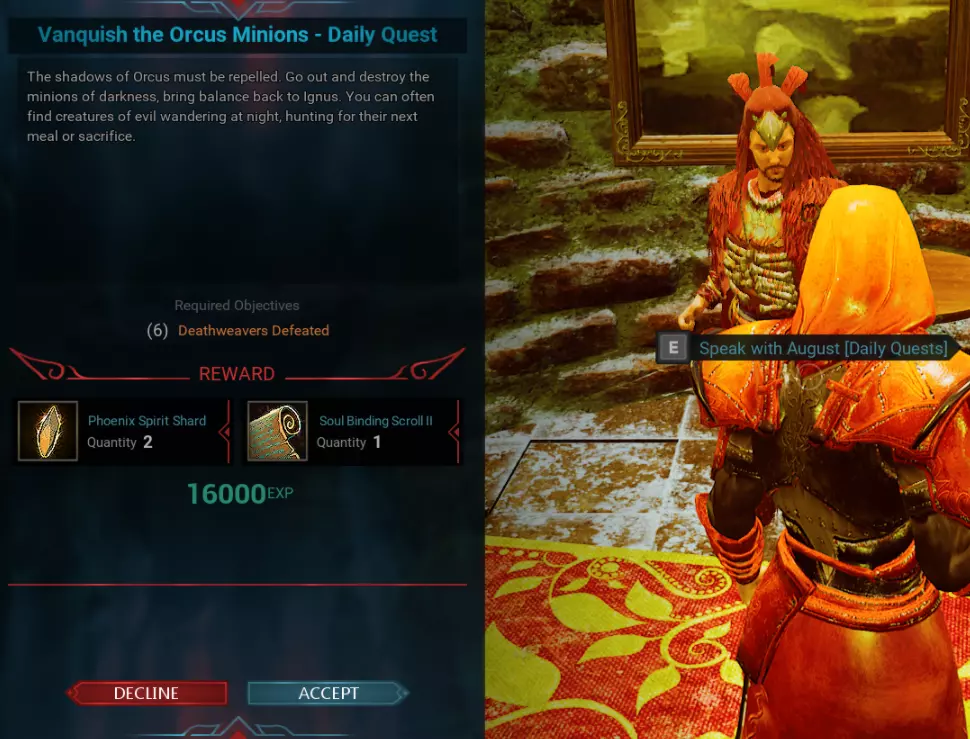 《城堡:火焰之怒》碎片日常任务 世界各处分布着可接取的日常任务,完成后能获得碎片奖励。 凤凰之灵地穴 - 奥蕾莉亚【日常任务】 位置在北0.38 - 东0.38,NPC名为奥蕾莉亚。该任务每日仅可完成一次。奖励和任务要求会每日自动变更。 更新:例如在奥蕾莉亚的这个任务中,要求击杀2只火蜥蜴……我们发现可以通过按下“L”键打开任务日志,点击“放弃”任务后重新接取,来获取其他任务。任务可能会变为击杀10只骷髅,或驯服1头麋鹿等其他内容。如果无法完成某些任务,只需使用此方法即可从NPC处接取与最初不同的其他任务。