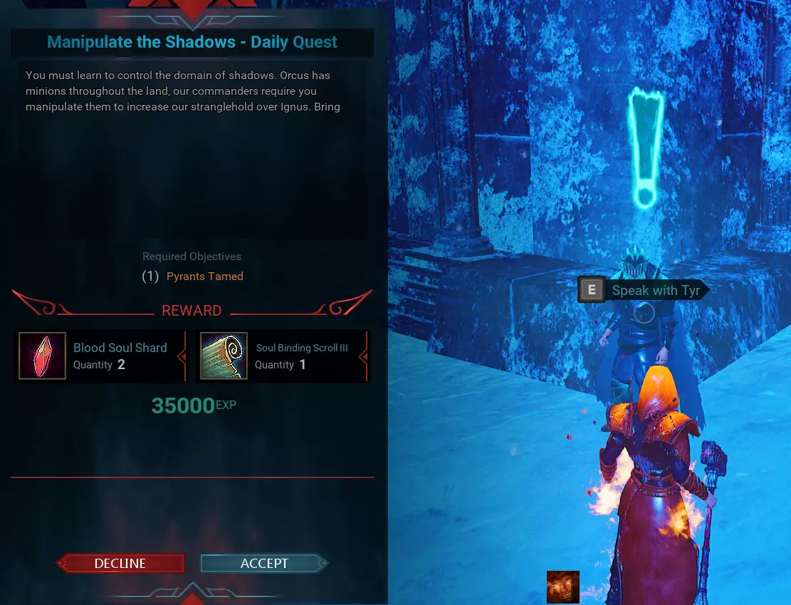 【血色灵魂地穴 - 提尔】[每日任务] 位置在N 3.64 - E 0.36,NPC名称为提尔。此任务每天只能完成一次。奖励和任务要求会每天自动更改。 更新:例如在提尔的这个任务中,要求驯服1只火焰元素……我们发现可以通过按“L”打开任务日志,然后按“放弃”任务并重新接取任务来获取其他任务。任务可能会变为击杀10个骷髅,或者变为驯服1只麋鹿等。如果无法完成某些任务,只需使用此方法即可从NPC处获取与最初接取的任务不同的其他任务。