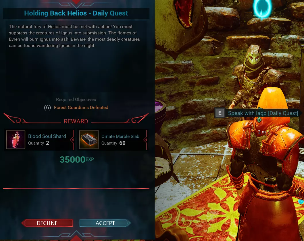 拉戈【每日任务】 任务地点位于北5.32 - 东1.69,NPC名称为拉戈。该任务每天只能完成一次。奖励和任务要求会每天自动变更。更新:例如在拉戈的这个任务中,要求击杀6只森林守护者……我们发现可以通过按下“L”键打开任务日志,然后点击“放弃”任务并重新接取,来获取其他任务。任务可能会变为击杀10只骷髅,或者变为驯服1头麋鹿等其他内容。如果无法完成某些任务,只需使用此方法即可从NPC处获取与最初接取不同的其他任务。