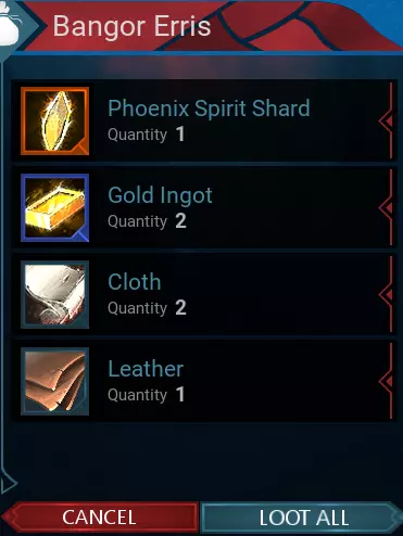 凤凰碎片 - 班戈埃里斯洞穴 首领名称为班戈埃里斯,它会掉落1到3个凤凰碎片,具体数量取决于你的魔法寻找值。洞穴位于N 4.44 E - 3.96,洞穴内怪物的重生时间约为10-15分钟。此外,首领身后会生成2个宝箱,有机会掉落额外的碎片,记得去查看!