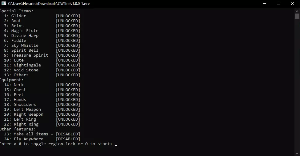 功能列表: 1. 移除装备区域锁定(可配置受影响的物品) 2. 移除特殊物品区域锁定(可配置受影响的物品) 3. 所有物品强化 4. 允许在任意地点飞行 注意事项: - 切换区域时,你的生命值会跃升至100万,但在攻击或与任何物体互动后会恢复至最大生命值。 - 该工具目前在多人游戏中运行良好,仅影响运行该工具的客户端,与谁是主机无关。因此,如果你和朋友都想获得“自由漫游”的相同效果,每个玩家都必须自行拥有该工具并激活,才能禁用区域锁定。 警告:该工具并非成品。此工具未经充分测试,可能会损坏您的存档。如果您在乎自己的角色,请备份存档。 如果工具仍无法运行: 1. 验证游戏文件 2. 确保您已安装最新版本的VC_Redist.X64.exe 3. 尝试以管理员身份运行该工具。 祝您使用愉快!