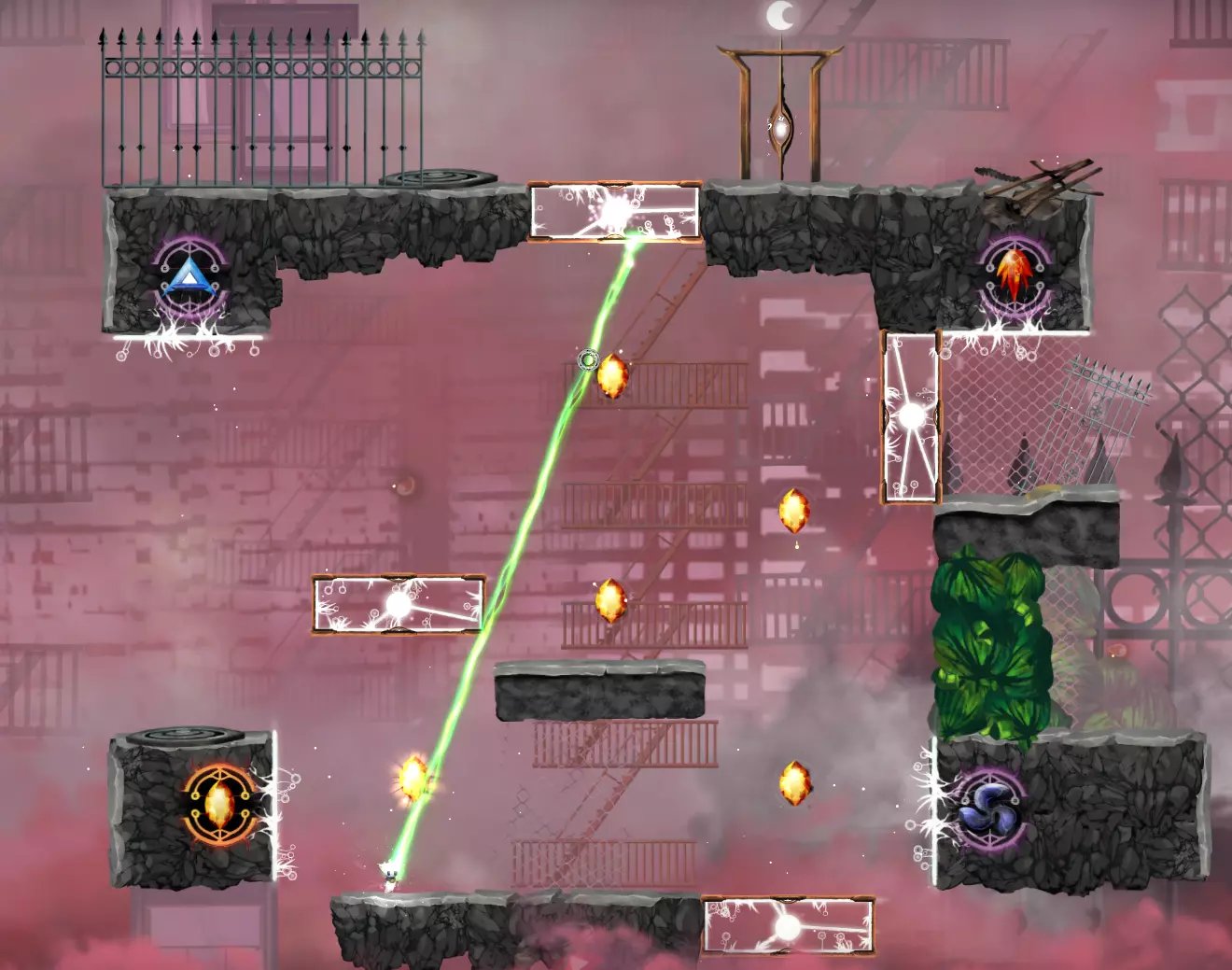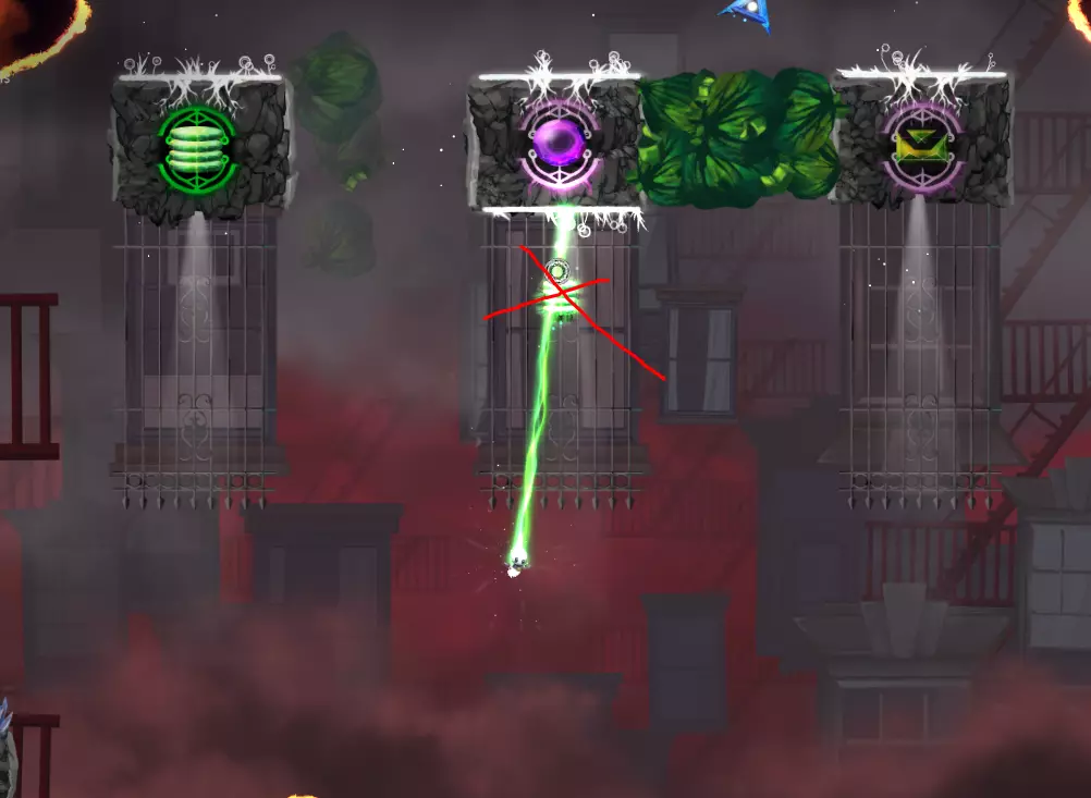 世界8,第4关——到达这里不需要任何神器,只需使用3个牵引水晶即可。使用第一个水晶打破箱子并就位,然后对准双牵引水晶,跳跃到第一面墙的顶部。接着从那里直接跳到花朵处(你也可以贴着双牵引水晶一侧的第一面墙右侧,获得额外跳跃从而登上墙头)。不过,有些神器可以加快过关速度,比如【风暴之心】能让你更容易对准更佳轨迹,【充能包】提供二段跳,【冲天蓟】则能让跳跃更轻松。