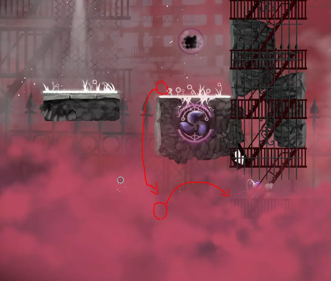 第九世界第三关——到达这里完全不需要任何遗物,因为你可以直接激活无敌状态,或者获取足够的跳跃次数从右侧到达。不过,有些遗物能让你更快抵达,比如【遗忘记忆】可以让获取大量跳跃次数变得更简单,还有【向空蓟草】。