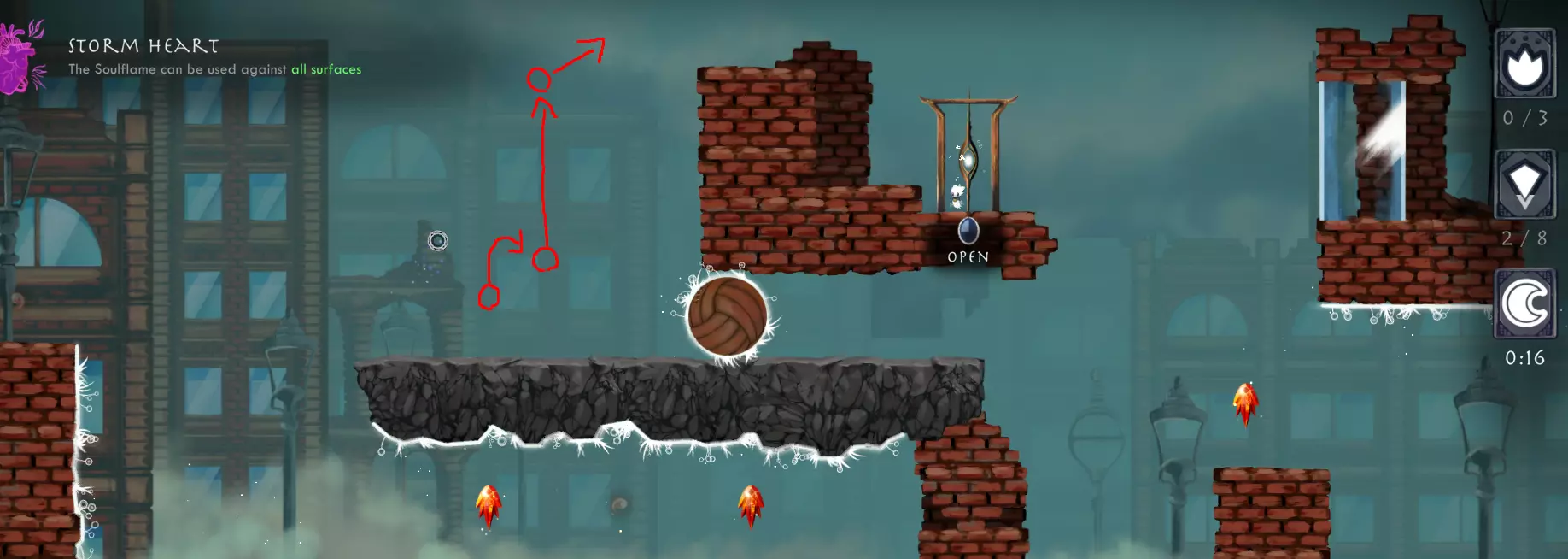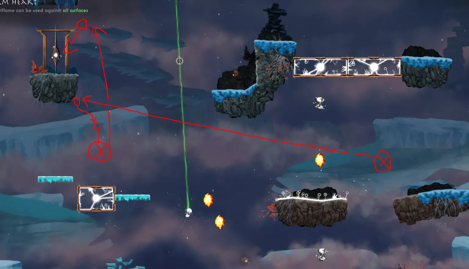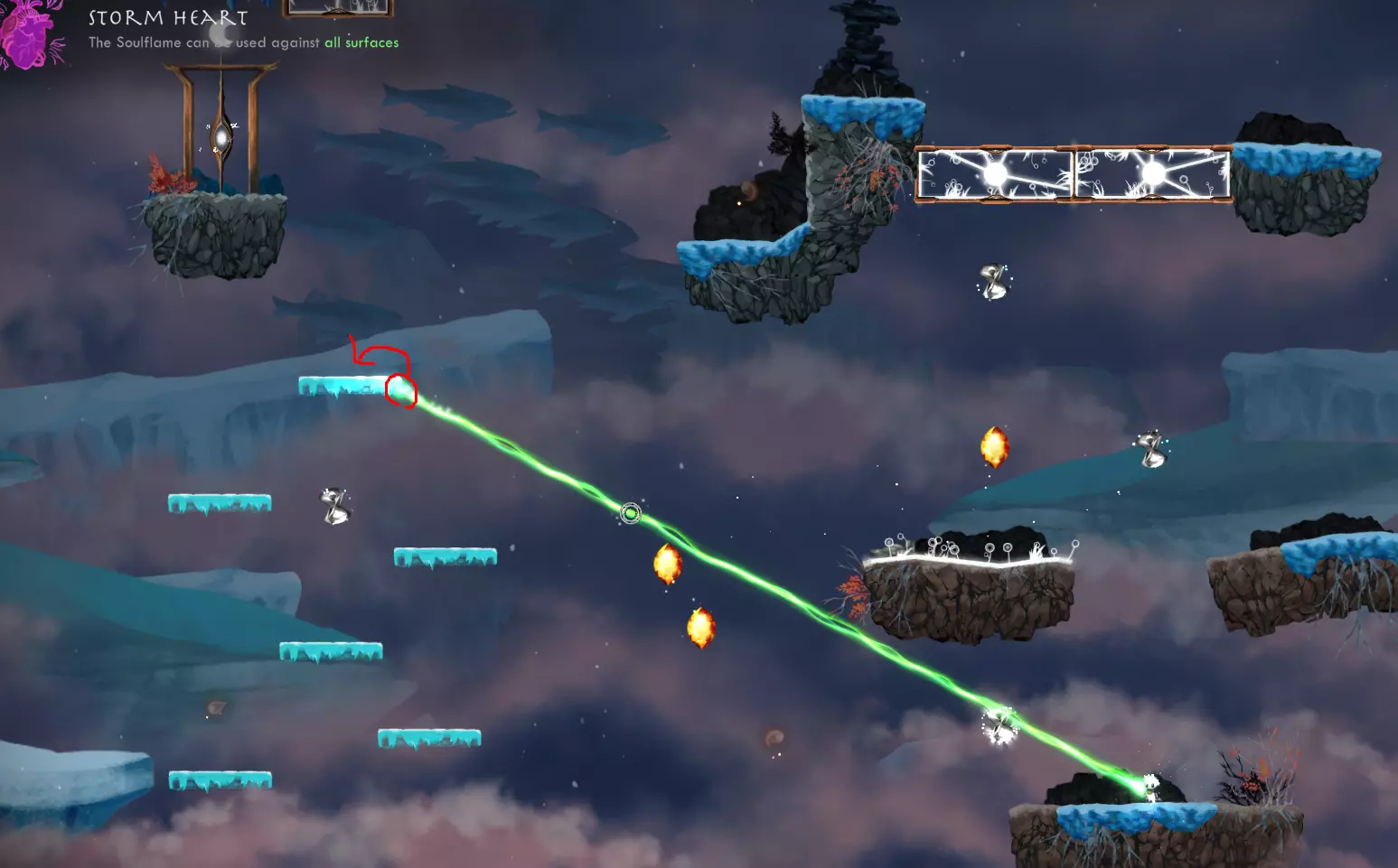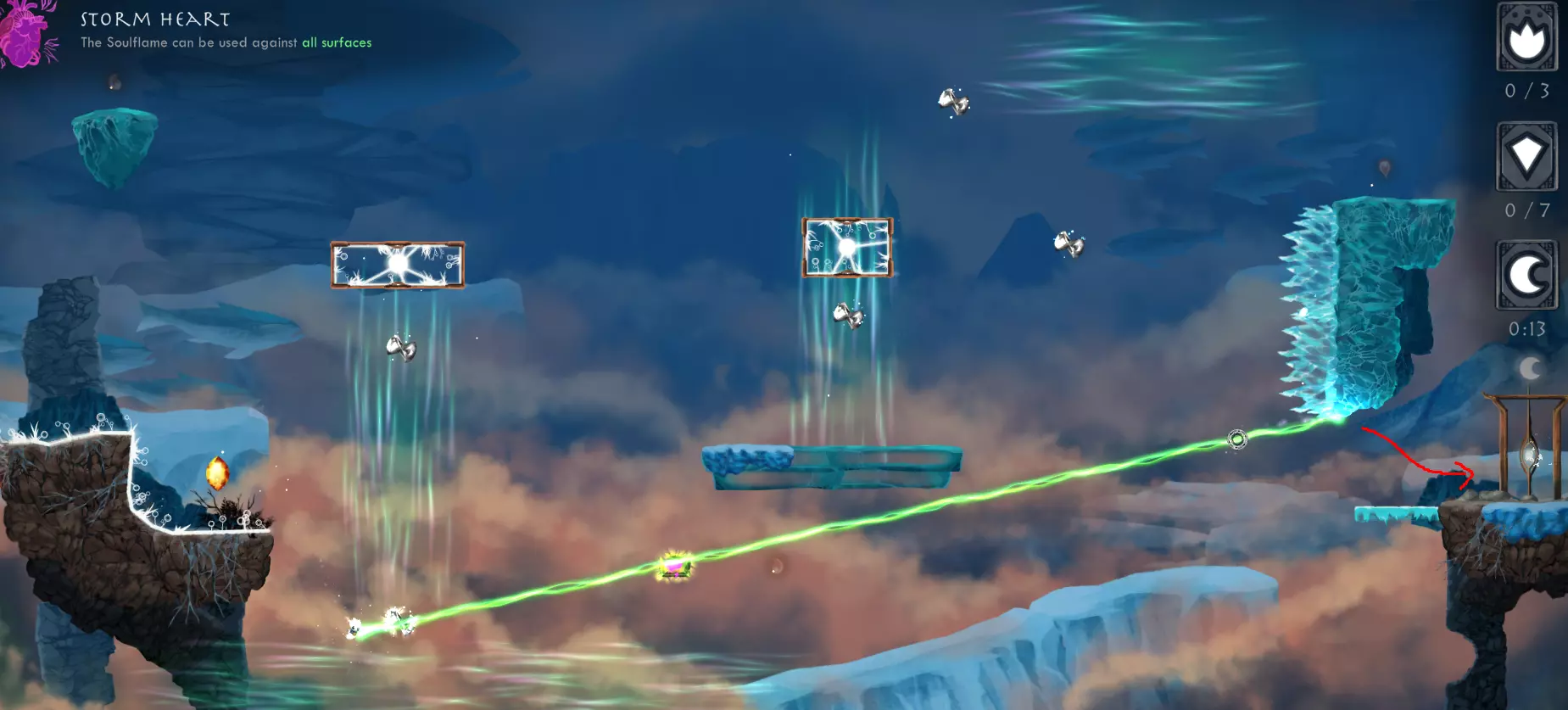 【Just One Shot】-仅使用一次灵魂火焰到达任意传送门。 我不记得是在哪里解锁的这个成就,但你可以在世界1的第一关轻松完成。方法是使用来自世界2的第二个遗物【Skyward Thistle】。实际上,你甚至可以在不使用灵魂火焰的情况下完成这一关,而且仍然能及时拿到时间精华。我刚才测试时就做到了,用时0.68秒。