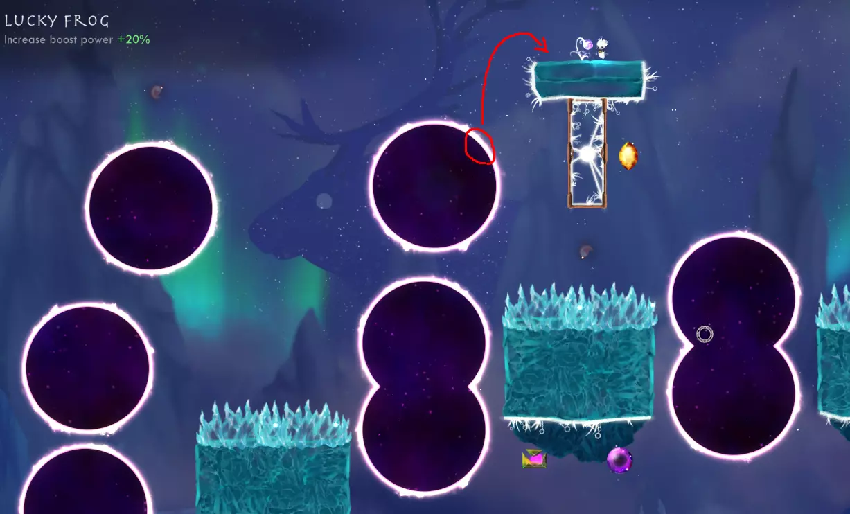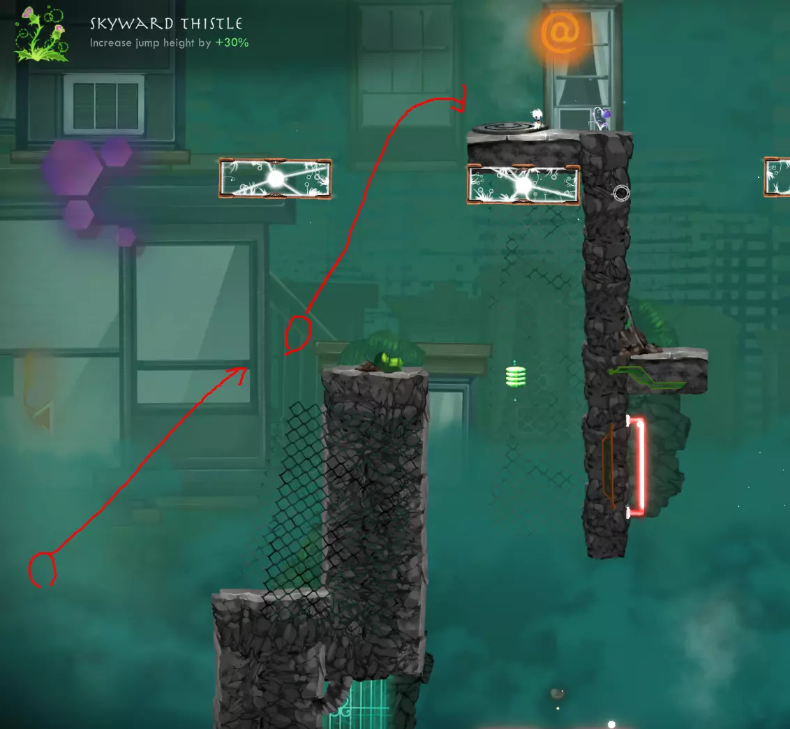 世界5,关卡1——严格来说,你不需要任何遗物,因为你可以正常游玩关卡并从传送门到达这里,或者你也可以在一开始就通过精准使用加速水晶直接到达。不过,有些遗物可以帮助你更快到达这里,比如【充能包】、【仿生腿】、【冲天蓟】(某种程度上,它能让你更容易找到合适的路线来通过加速跳到边缘并再次跳跃)、【飞泉莲】和【幸运蛙】。