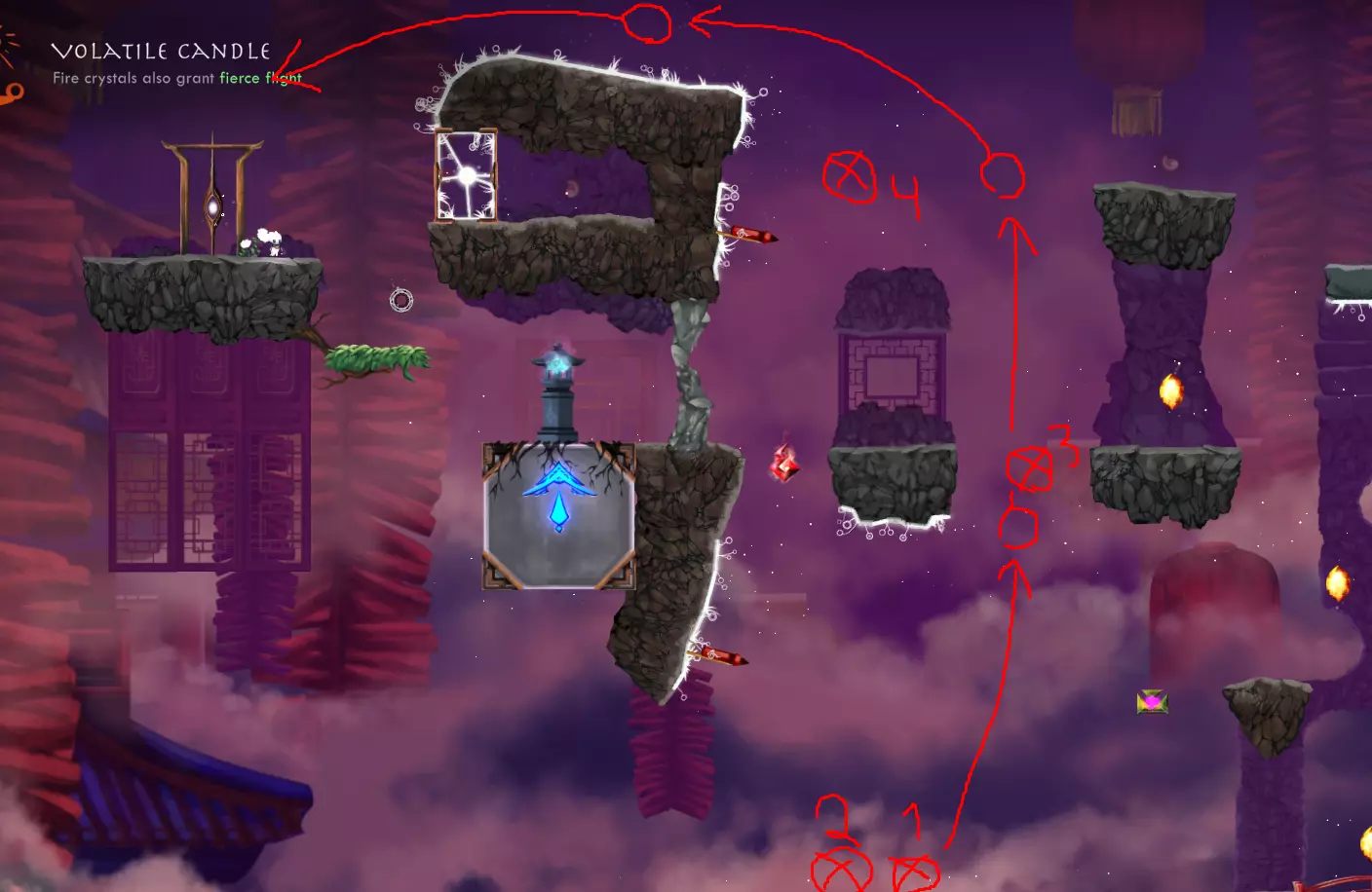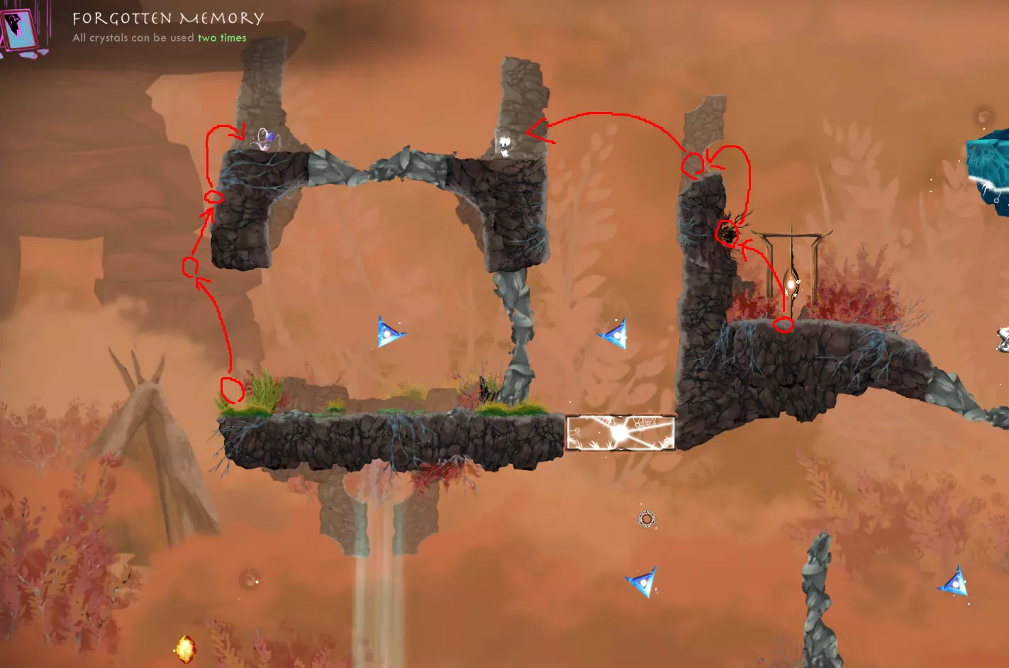 石墙捷径 - 跳过中央柱子可直达暗林7号门。我是通过使用【遗忘记忆】神器做到的。借助助推水晶向上,需要停留时就使用岩石水晶。不过如果没用无敌状态,得小心那些飞鸟。