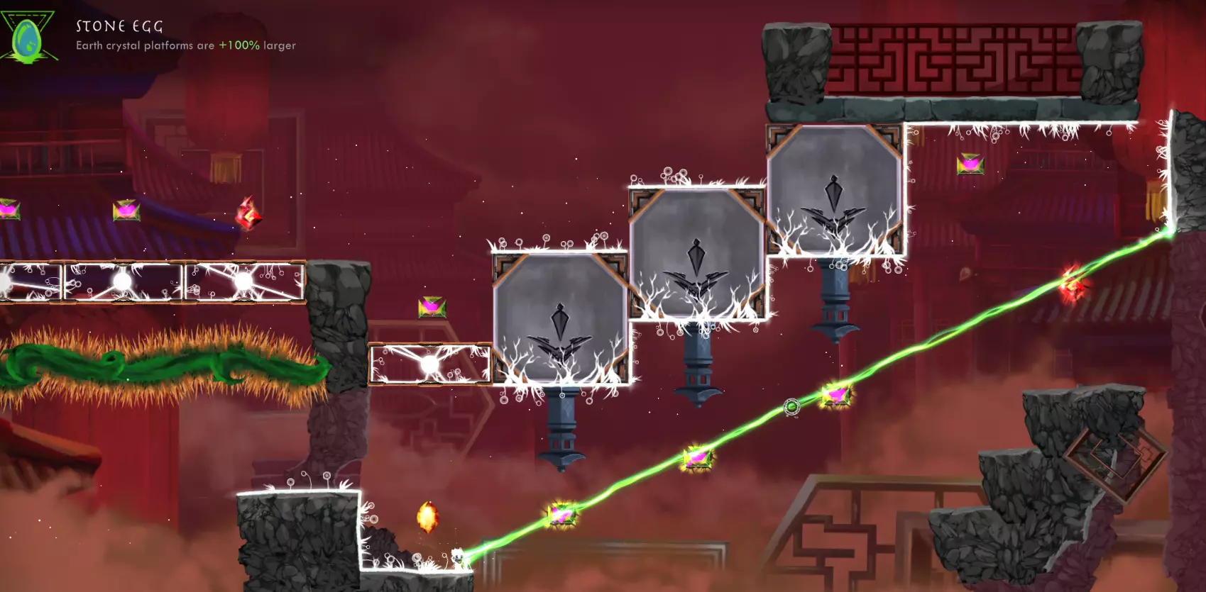 【成就:Grounded】- 不跳跃到达任意5个大门。 达成示例: 世界3,第6关 - 使用“不稳定蜡烛”,你可以利用火焰水晶向上推进并到达大门。操作顺序如下:从起始位置的右侧火焰水晶开始,接着使用左侧火焰水晶,此时你将获得足够高度,瞄准下方激活靠近加速水晶的火焰水晶,这会将你送到顶部的岩石区域。落地前,对准顶部附近的火焰水晶,它将把你推进至大门。