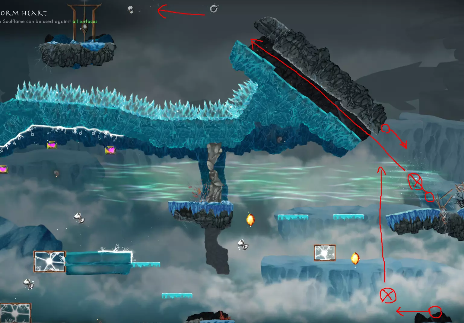 世界4,第3关 - 使用【风暴之心】神器,从起点出发,利用传送+岩石水晶组合,瞄准冰平台上方的岩石天花板进行传送,即可到达大门,且仍有平台可供站立。