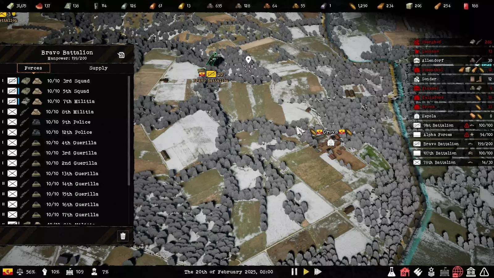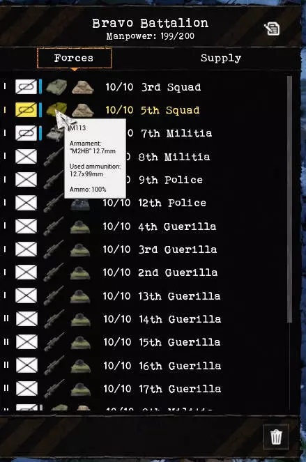 在营级视图的最下方,可以从标准和警察这两种预设小队类型中创建相应的小队。小队初始只有一名士兵,若有足够的新兵和装备,且该营驻扎在这座城市,小队会随时间自动补满人员。后续可通过小队编辑器创建更多小队类型,但前提是相关装备已研发、具备或已生产。 此外,还需为营配备足够的消耗品,如弹药、食物和火箭筒。为此,需查看营的【补给】区域,并判断还缺少哪些物资。注意!城市也有自己的【补给】区域。遗憾的是,这两者不应混淆,它们的名称相同。在城市的【补给】区域,除了已列出的城市外,还可以选择部队,并向其运送物资以建立充足储备。 战斗车辆上的蓝色垂直条也表示弹药供应情况。将鼠标悬停在白色信息框上会显示相应的弹药类型。然后可以点击各个城市,查看哪里有这种弹药,再通过运输队将其运送到部队,以确保多次战斗的弹药供应。