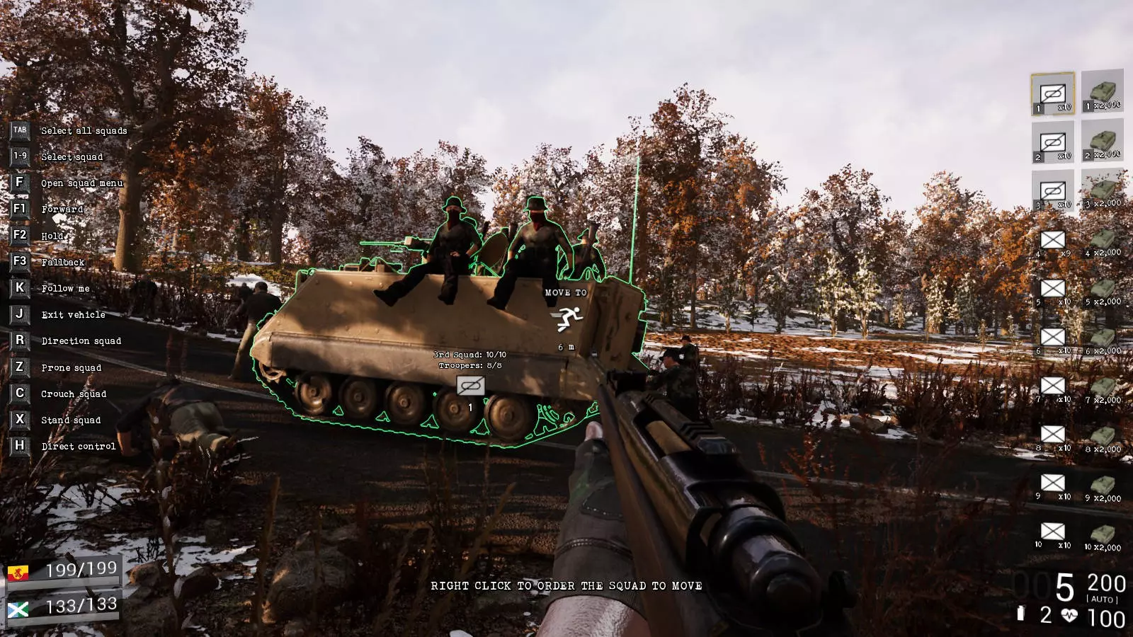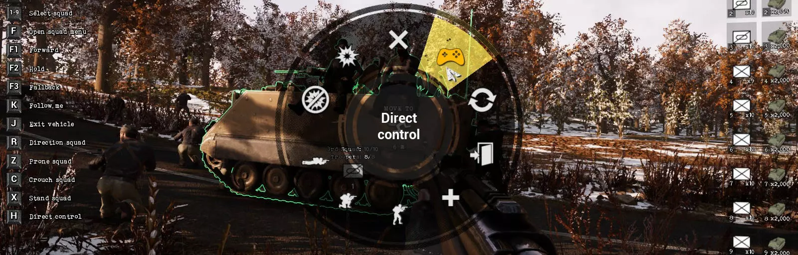 按下【F】键可进入直接选择模式。在此模式下,你可以选择一个小队,之后小队中的每个士兵都能被单独选中。若当前选中的士兵倒下,你可以选择另一名士兵。你也可以通过这种方式在不同位置的小队之间切换,并以第一人称射击的操作方式手动介入战斗。目前,战斗载具的威力异常强大,在合适的距离下,完全可以用它们摧毁所有敌人。不过,这样做会大大降低游戏的紧张感。