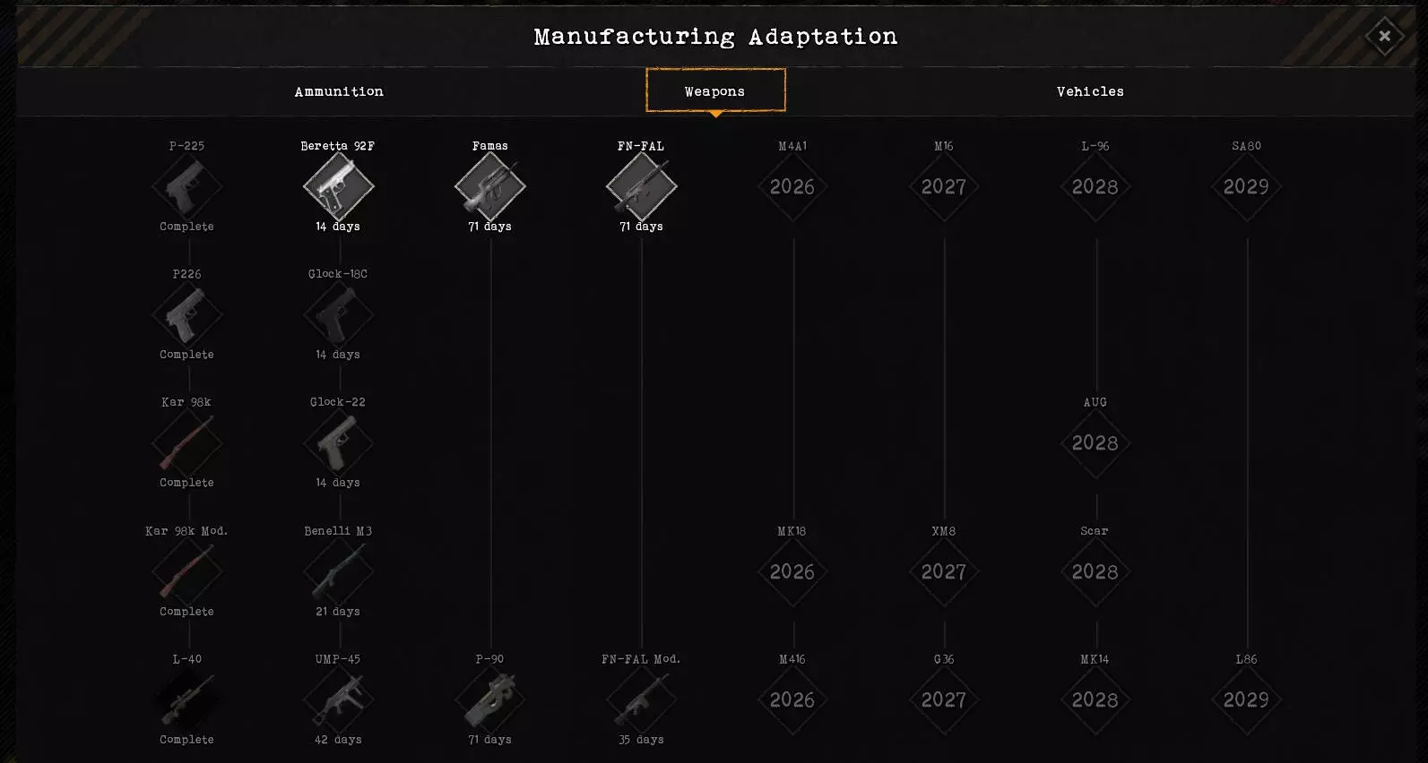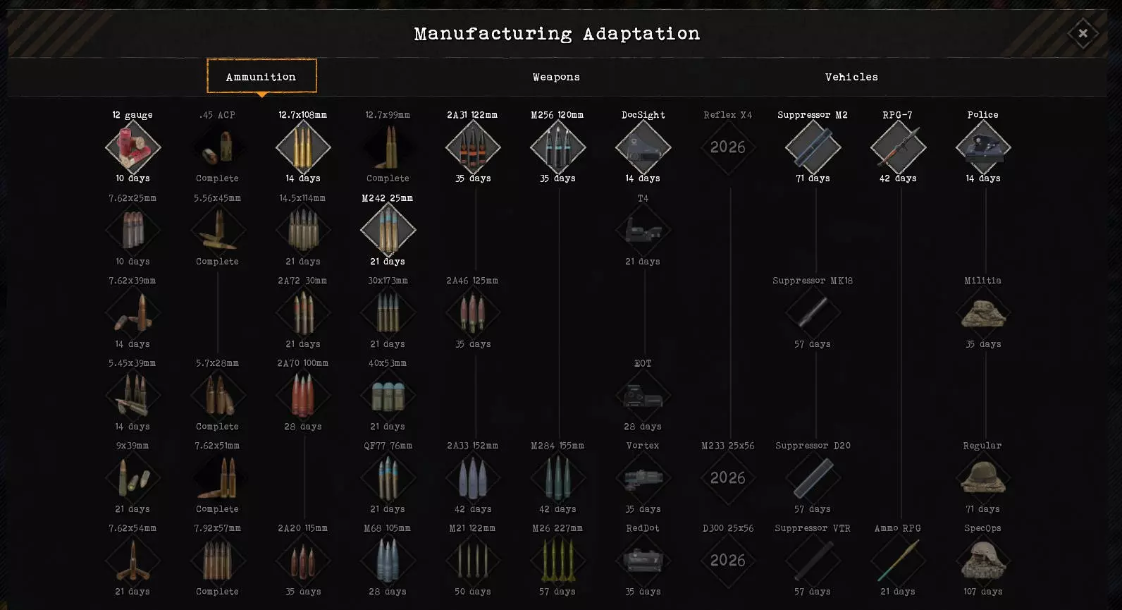 初期重要的是远离手枪。它们射程较短,配备手枪的单位最多只能用于巷战。左侧的研究分支从普通步枪延伸到狙击步枪。配备这类武器的单位在常见的野外战斗中非常实用。最右侧是尚未解锁的武器类型,这些武器要在游戏进程中达到相应年份后才会解锁研究,并且威力更强。通过【研究中心】建筑可以加快研究速度。强烈建议在游戏初期就建造该建筑,以免之后在与其他派系的“军备竞赛”中因装备落后而处于劣势。 研究 - 弹药
