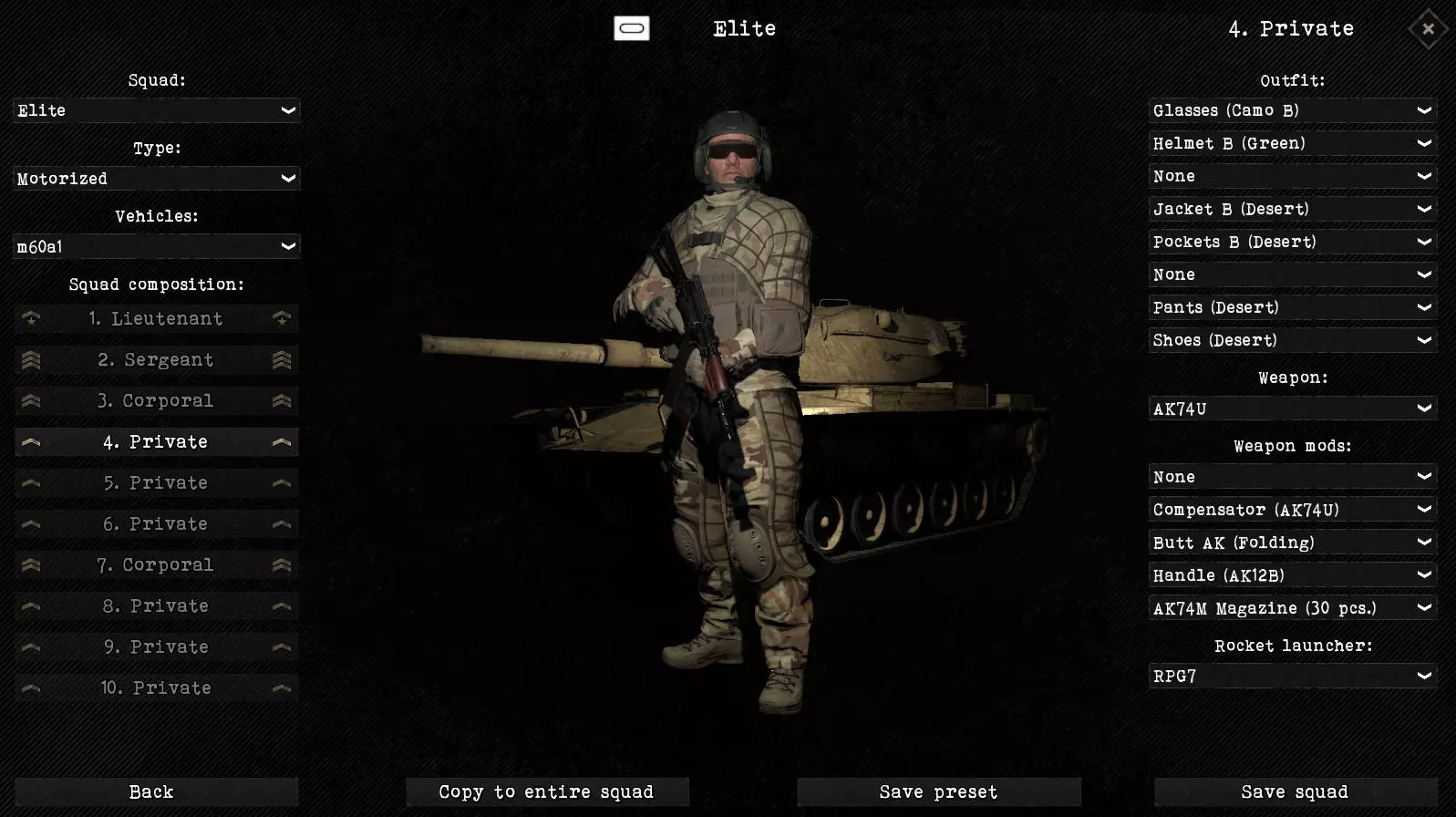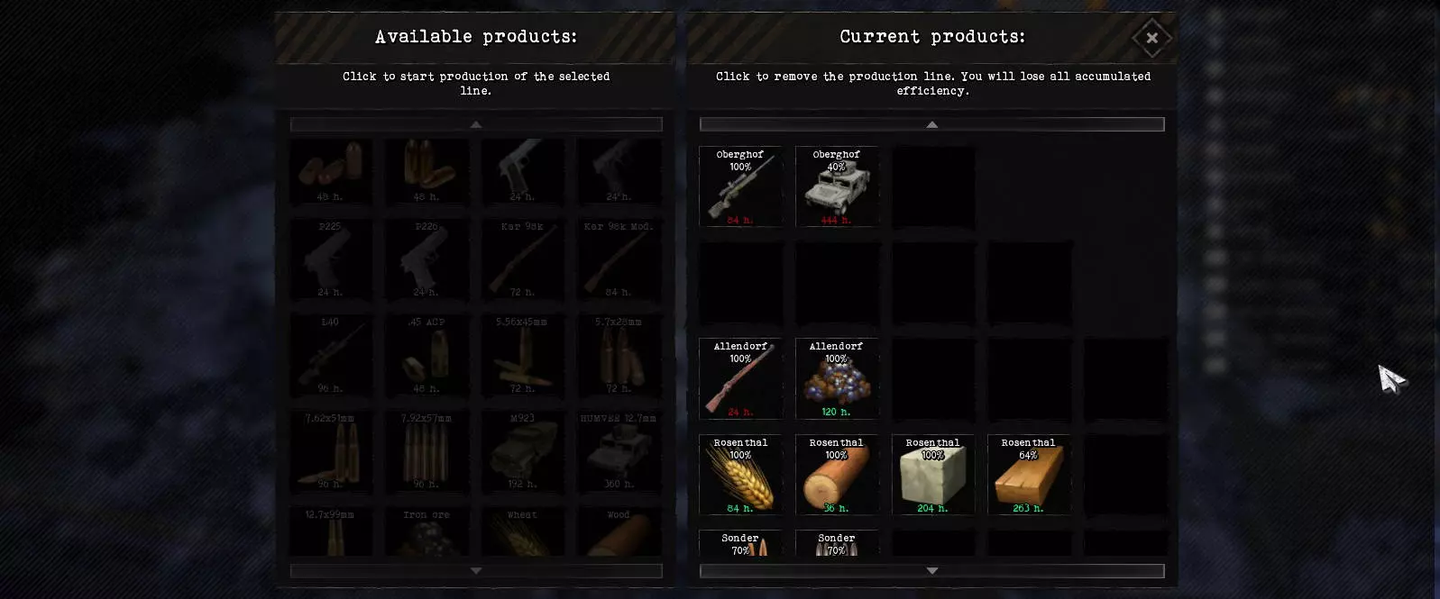 生产用于制造原材料、武器、弹药、战斗载具和食物。只有在城市中建造了相应类型的建筑后,生产才成为可能。对于武器、弹药和载具,研究还决定了可以生产的类型。 过剩的产品也可以通过世界市场出售。金钱主要用于建造新建筑。 你可以随时更改生产。当研究完成后有更强大的类型可供选择时,这对于武器、弹药和载具来说尤为必要。不过,生产运行的时间越长,效率就越高(在各个生产槽位中以百分比值显示)。小队编辑器 使用此编辑器可以详细规划小队(装备、武器、载具)。不过在初期,由于可研发和生产的现代化装备较少,该功能的实用性较低。