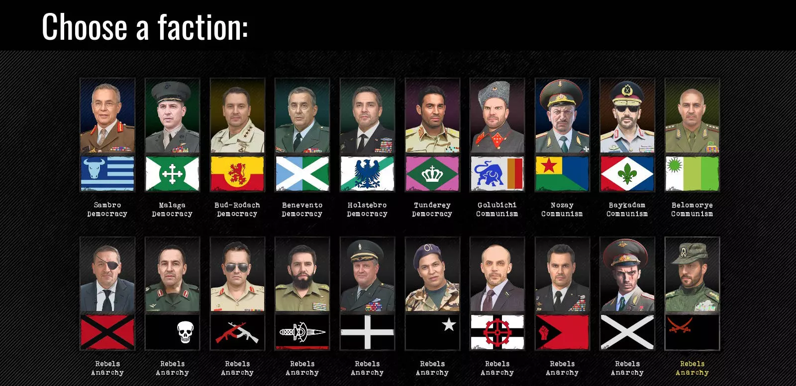 为了轻松开始游戏,你可以选择位于西部边缘的【Bud-Rodach】派系(民主政体 | 北约部队设计),或者选择位于东部边缘且拥有6座城市的【Belomorye】派系(共产主义部队设计)。 用户界面