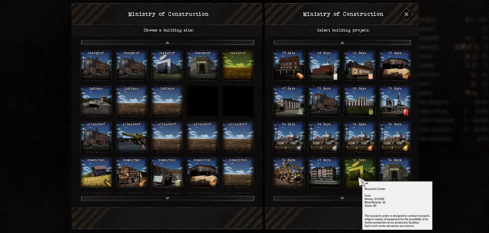 目前战斗载具的实力极强,往往能决定战斗的胜负。因此,建议尽早在该领域进行研究。游戏初期,钢铁和铝的供应情况相当良好,足以生产多辆载具,直到玩家建立起相关的原材料生产设施。研究合适的弹药也很重要,因为频繁使用载具后,弹药会相对较快耗尽。 建造与城市 根据城市类型的不同,可以建造各种建筑。每次只能建造一座建筑。