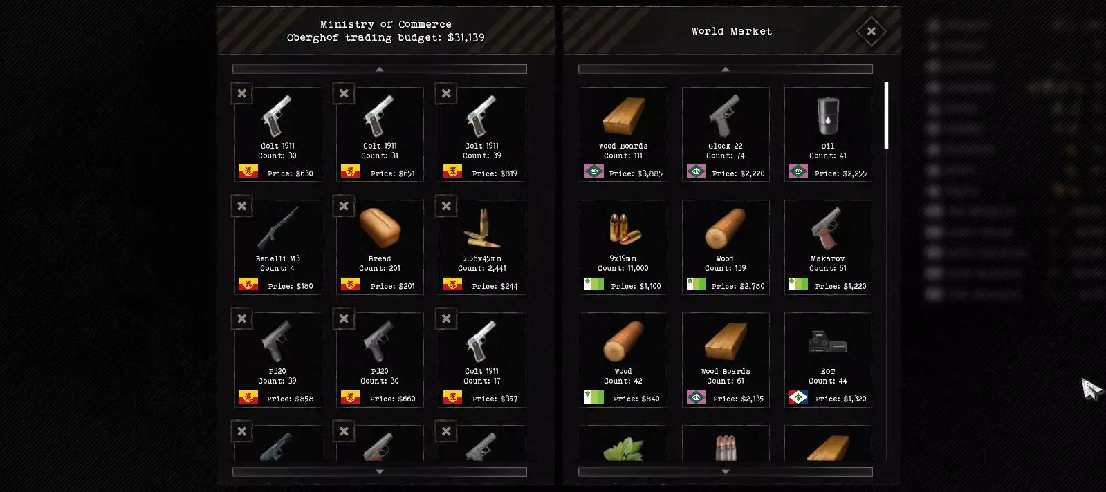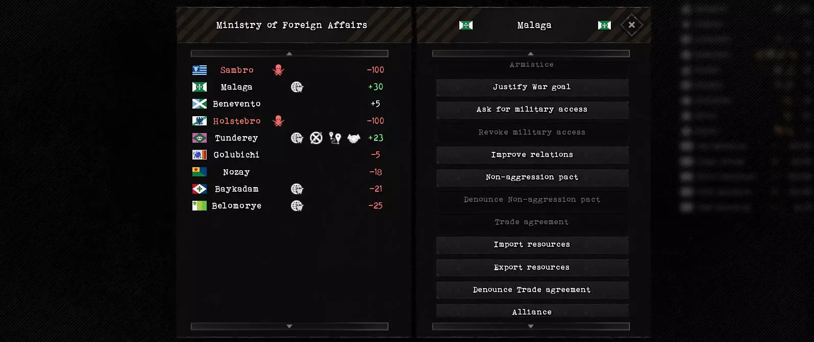 要进行相关操作,需点击一座城市或一支部队,然后进入【补给】区域。通过下拉菜单,可以选择另一座城市或有时是部队,通过运输队向其运送补给。在该菜单中,还可以选择【世界市场】(world market)。若通过运输队将补给运往那里,补给会显示在贸易区域的左侧窗口中。所提供的商品实际被购买可能需要一些时间。提供较小批量的商品也是合理的做法。 建议从一开始就出售仓库中大量的手枪,因为装备这些手枪的部队几乎无法用于作战。攻击部队将尽快配备步枪,届时会有许多手枪剩余且不再需要。 外交 在初始的“缓冲期”过后,外交很快就会变得重要起来,这样可以避免同时在多条战线作战。这会使军队严重损耗。新兵数量会迅速耗尽,损失补充得太慢。尤其是作战车辆,要到后期才能通过自行生产来补充。如果此时用一支纯步兵部队对抗拥有4-5辆作战车辆的敌人,那么根据战场地形的不同,情况会变得非常困难。当敌方战斗载具部署在开阔地带时,配备火箭筒的步兵很难接近。通常,他们会先被载具上射程极远的机枪消灭。