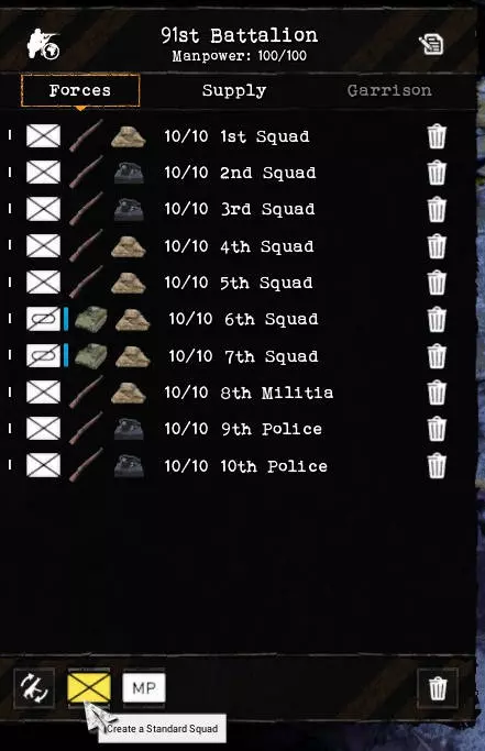 将装备有步枪和战斗载具的小队编入一到两个精锐营。那些只配备手枪的小队先撤下来,在他们至少装备步枪之前,不要让他们参与战斗,否则只会白白浪费新兵。 要组建更多装备精良的小队,需将所需的新兵、武器、装备和弹药派往一座城市,然后在那里进行组建。这座城市位于受保护的边缘区域,绝不能失守。 要通过运输队运送物资,需依次点击所有城市并进入“补给”区域。在那里选择装备,然后在“发送”下拉菜单中选择目标城市。当有足够的新兵、枪支和弹药抵达后,就可以用新的小队扩充营队。为此,必须进入【部队】界面。这是可以在地图上行动的机动营队。而【卫戍部队】则是固定的,目前无法从中抽调小队,只能将其解散以回收物资。